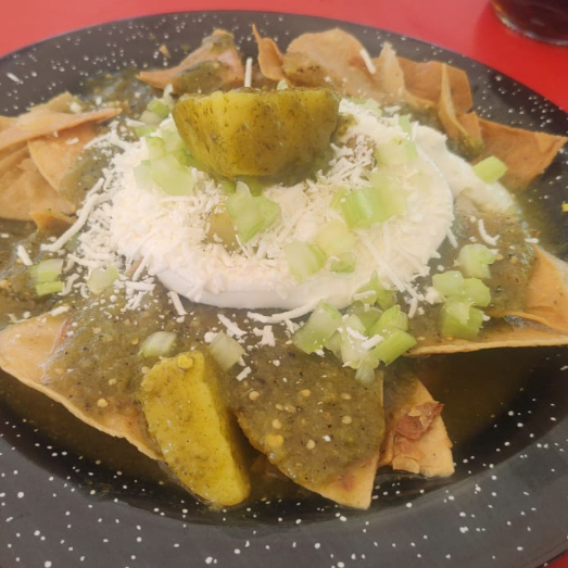Totopos fritos, doble salsa verde, crema, queso, pollo, apio