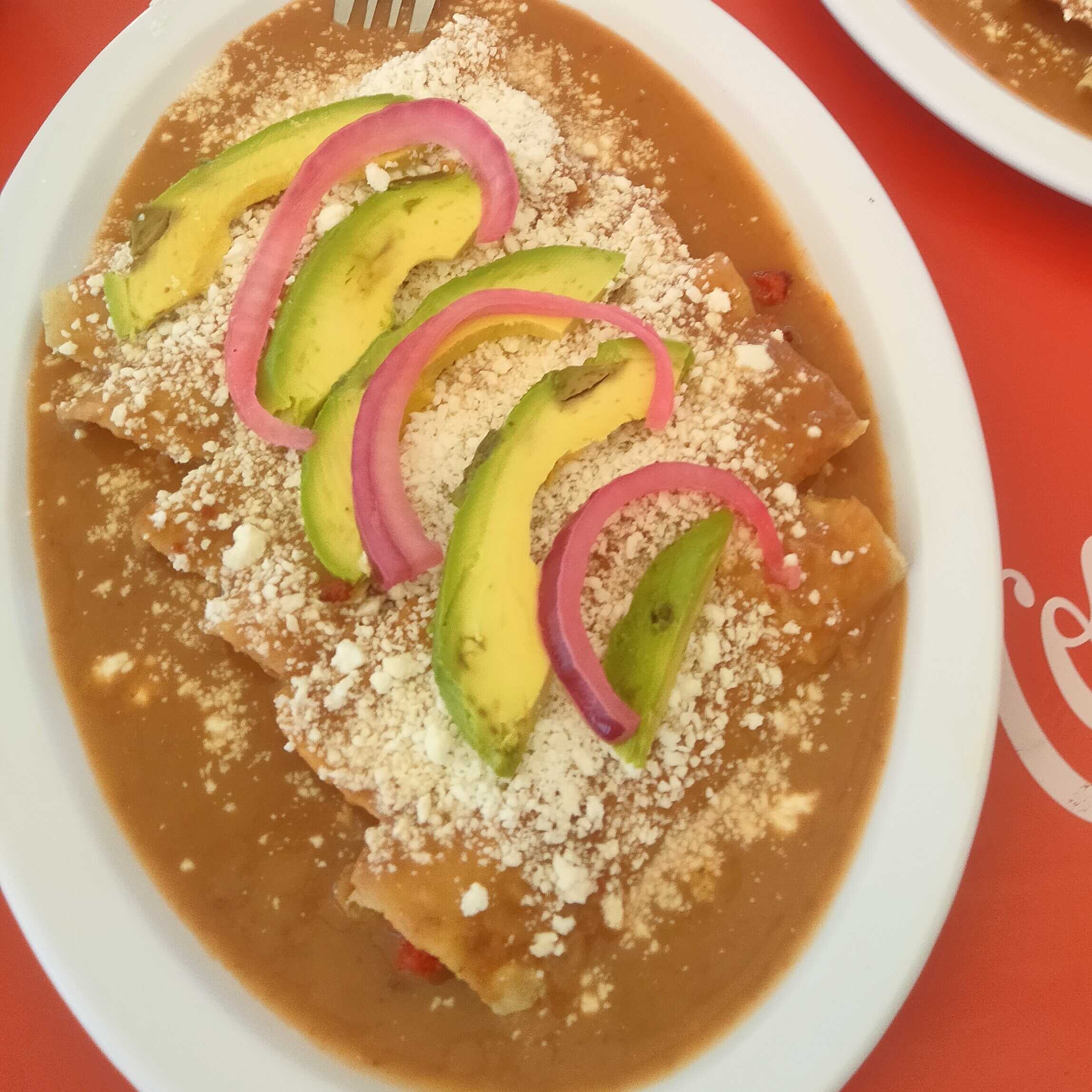 Tortilla, frijoles molidos, crema, queso, cebolla morada, aguacate, relleno a escoger pollo, chorizo o queso, 6 pz