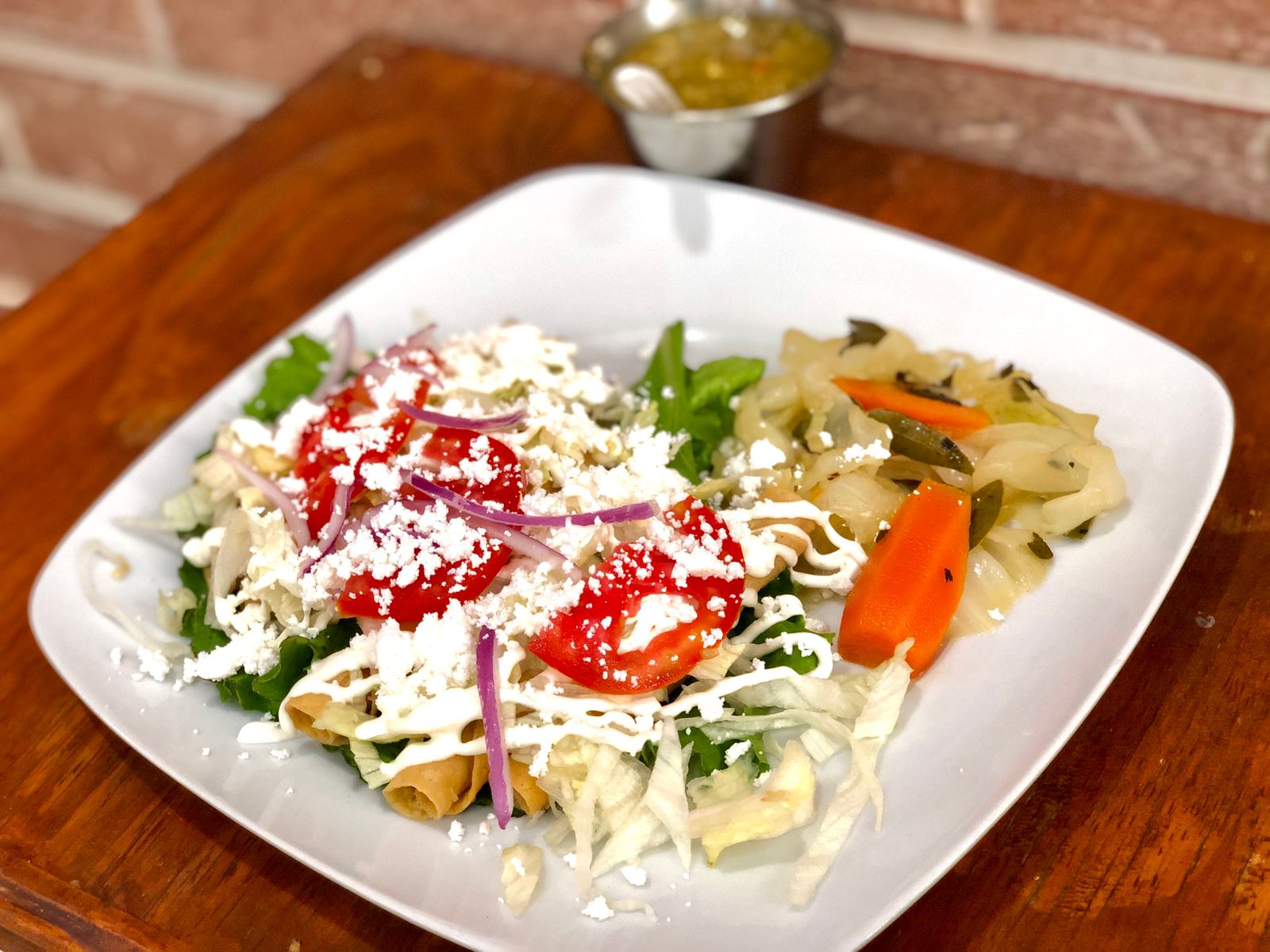 Lechuga, jitomate, cebolla, crema y queso.