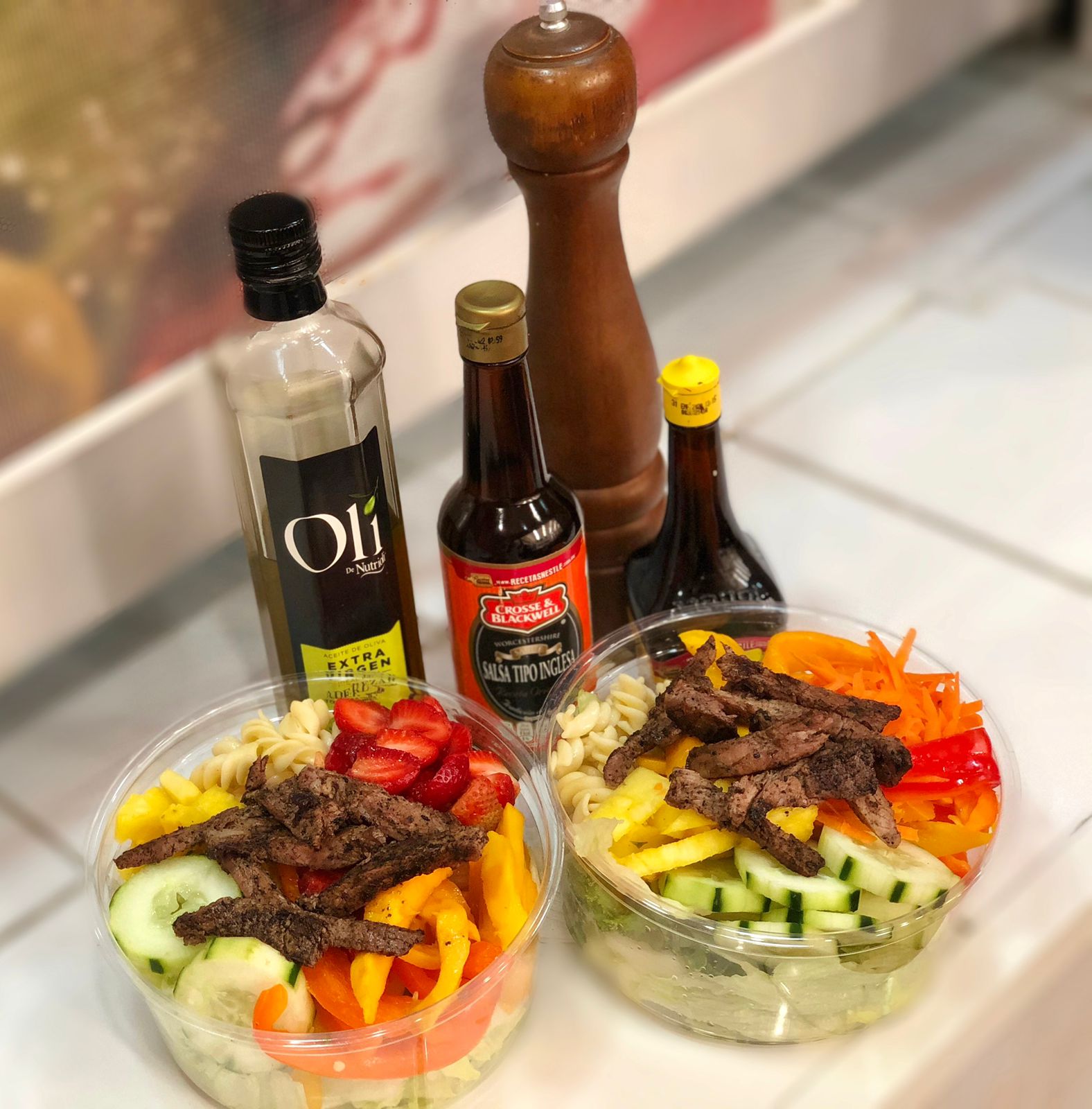 Proteína (arrachera), 5 ingredientes, incluye crotones, parmesano y ajonjolí.