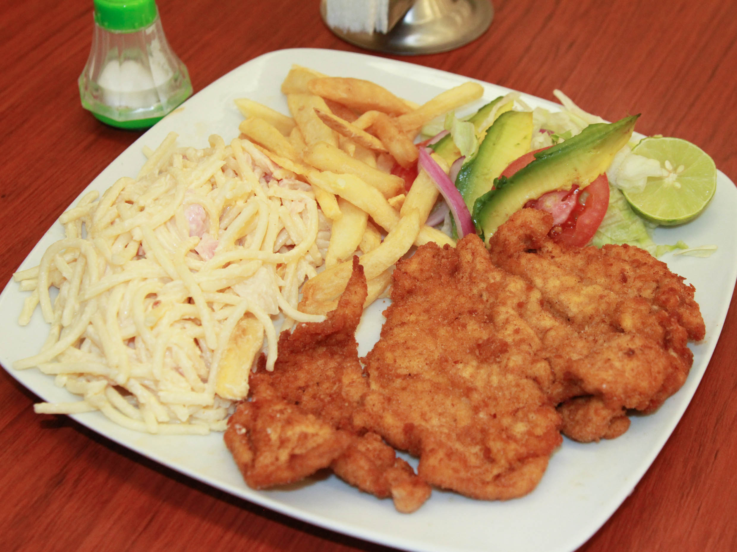 Spaguetti, papas a la francesa, ensalada, tortillas y salsa.