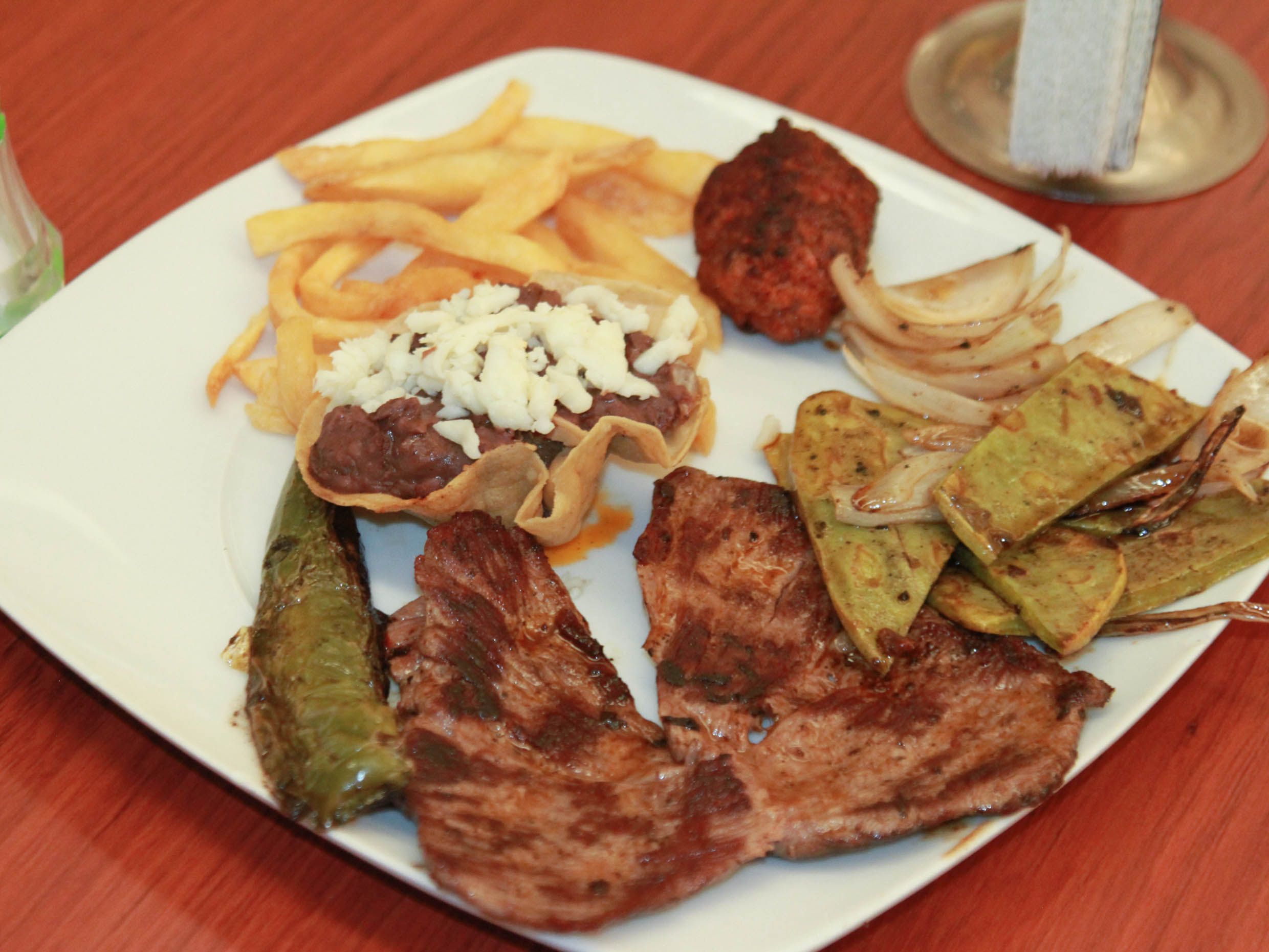 Frijoles,papas a la francesa, ensalada, tortillas, jalapeño,nopales, cebolla asada