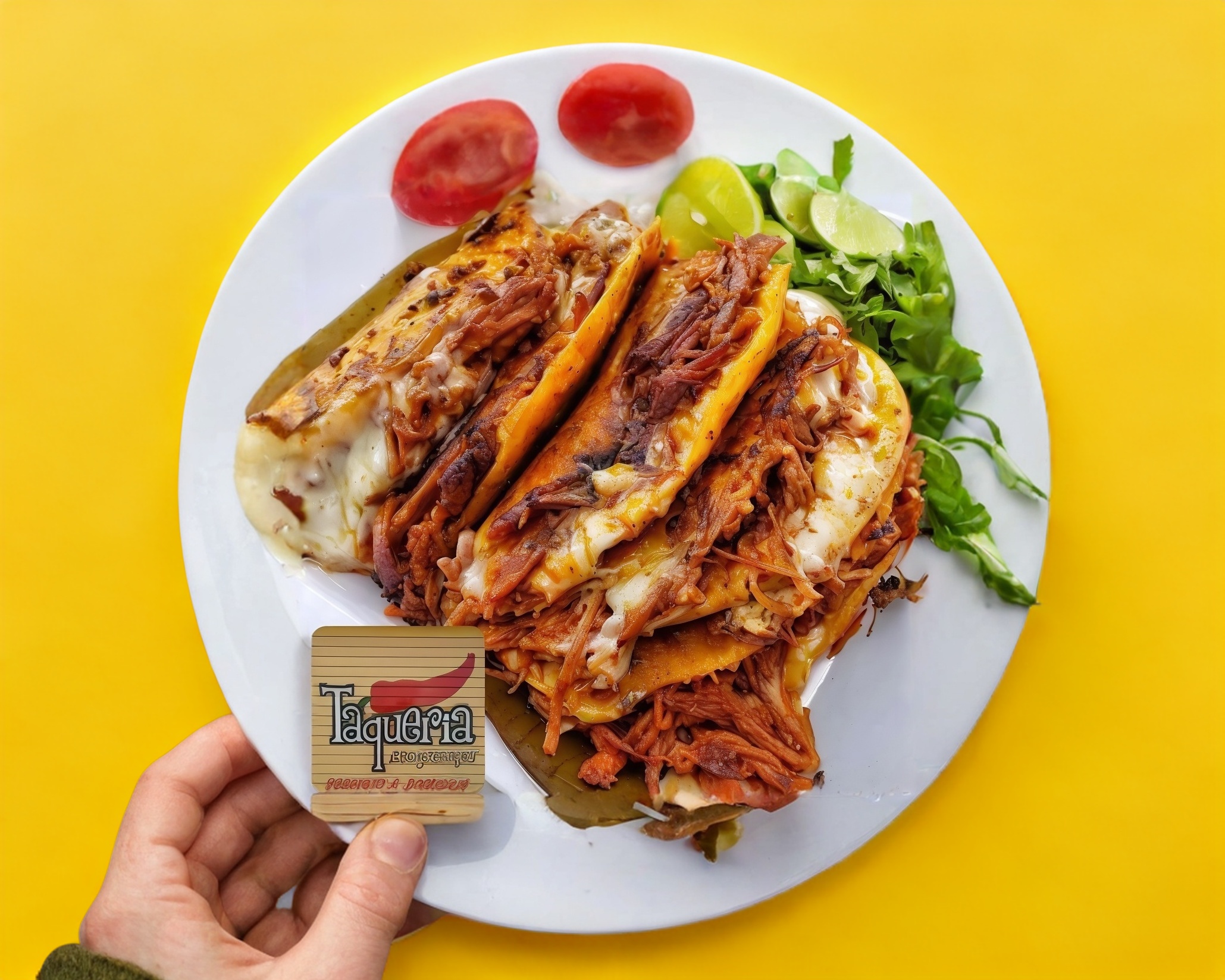 1 pza. Quesadilla doradita con caldo de la barbacoa de res con salsa, verdura, cebollitas asadas.