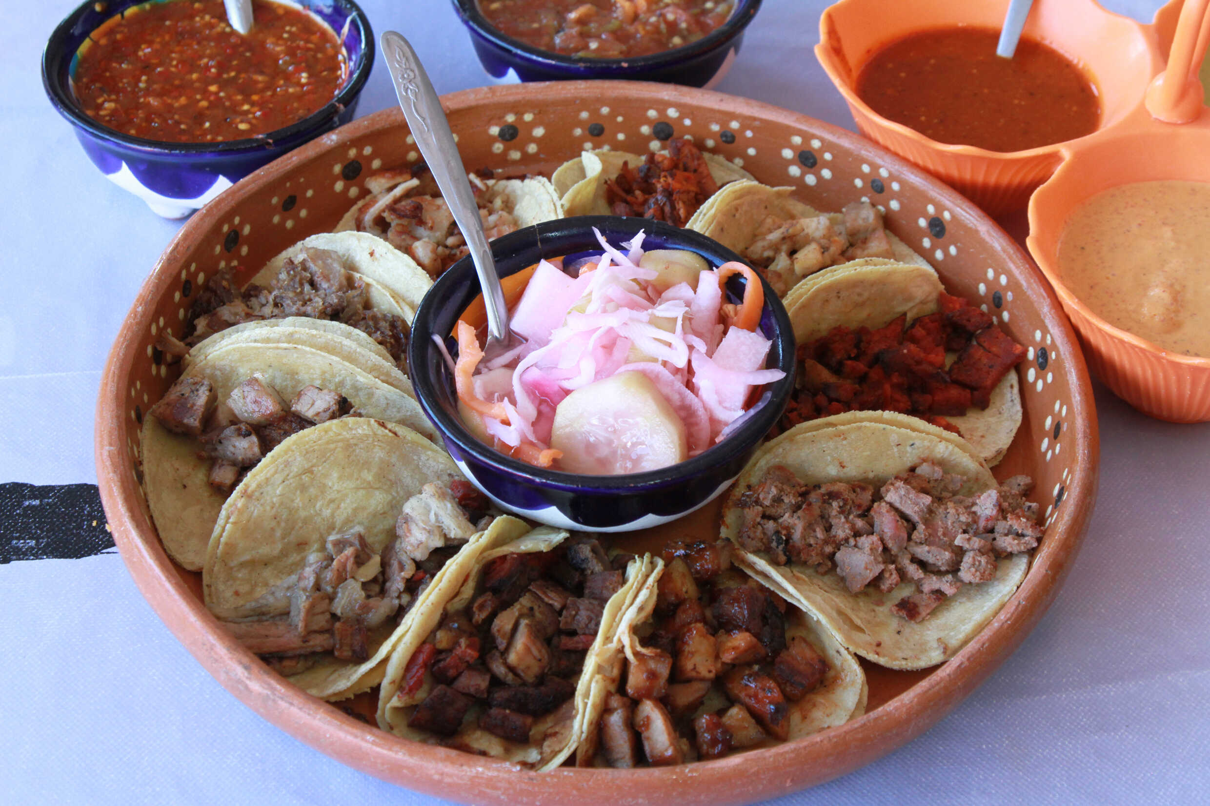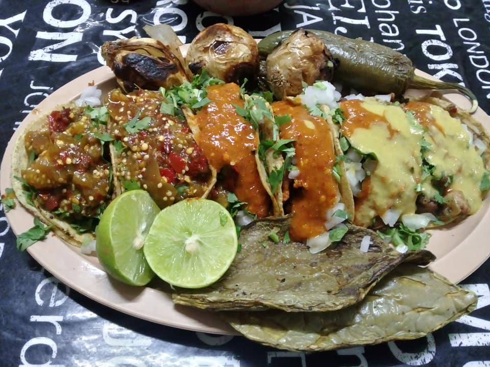 Incluye tortillas hechas a mano, chorizo, frijoles charros, nopales, cebollas, chiles asados, y salsa