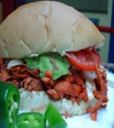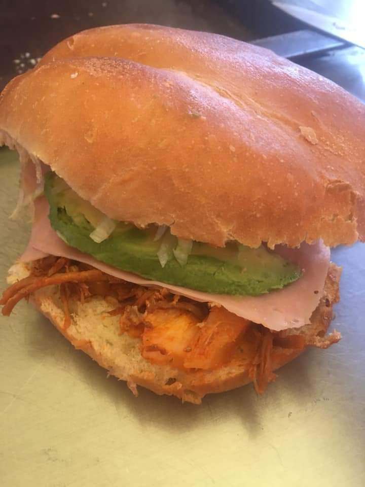 PIERNA ENCHILADA, PIÑA Y JAMÓN ACOMPAÑADA DE JITOMATE, CEBOLLA, CHILE, AGUACATE, LECHUGA Y MAYONESA.