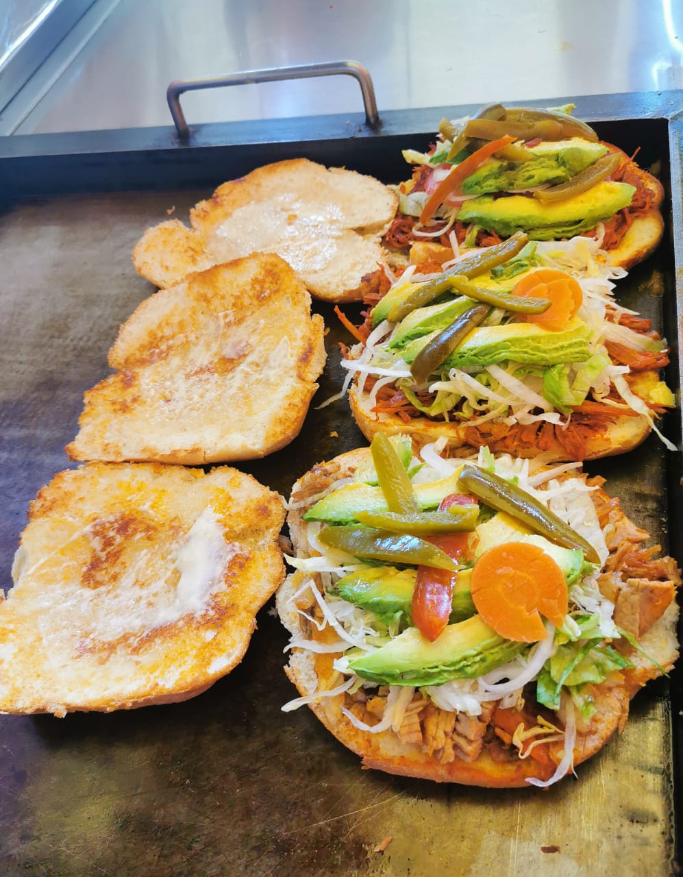 ACOMPAÑADA DE JITOMATE, CEBOLLA, CHILE, AGUACATE, LECHUGA Y MAYONESA.
