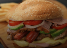 MILANESA, RES, TOCINO Y JAMÓN ACOMPAÑADA DE JITOMATE, CEBOLLA, CHILE, AGUACATE, LECHUGA Y MAYONESA.