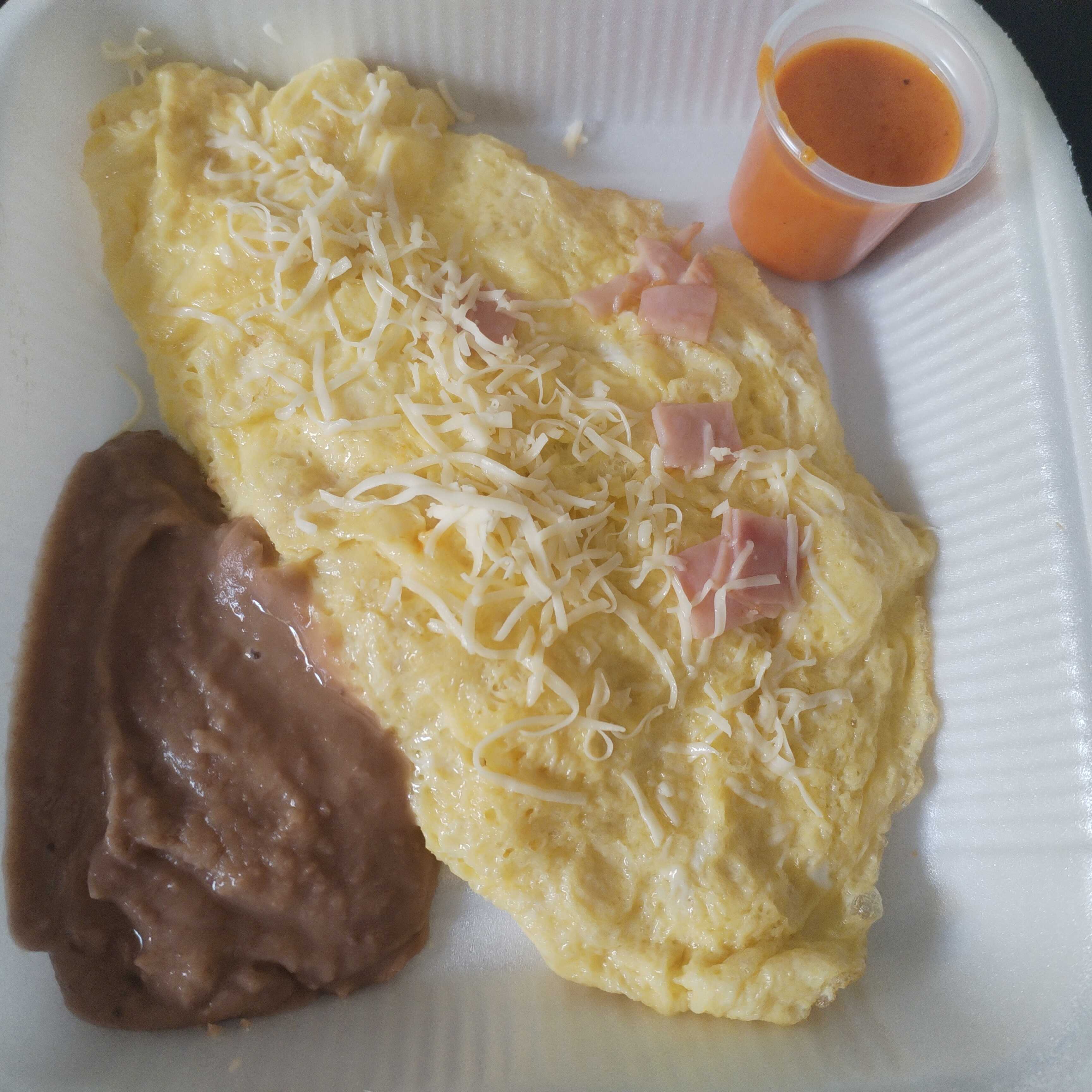 Omellete de jamon con queso, acompañado de frijoles, salsa casera y torillas