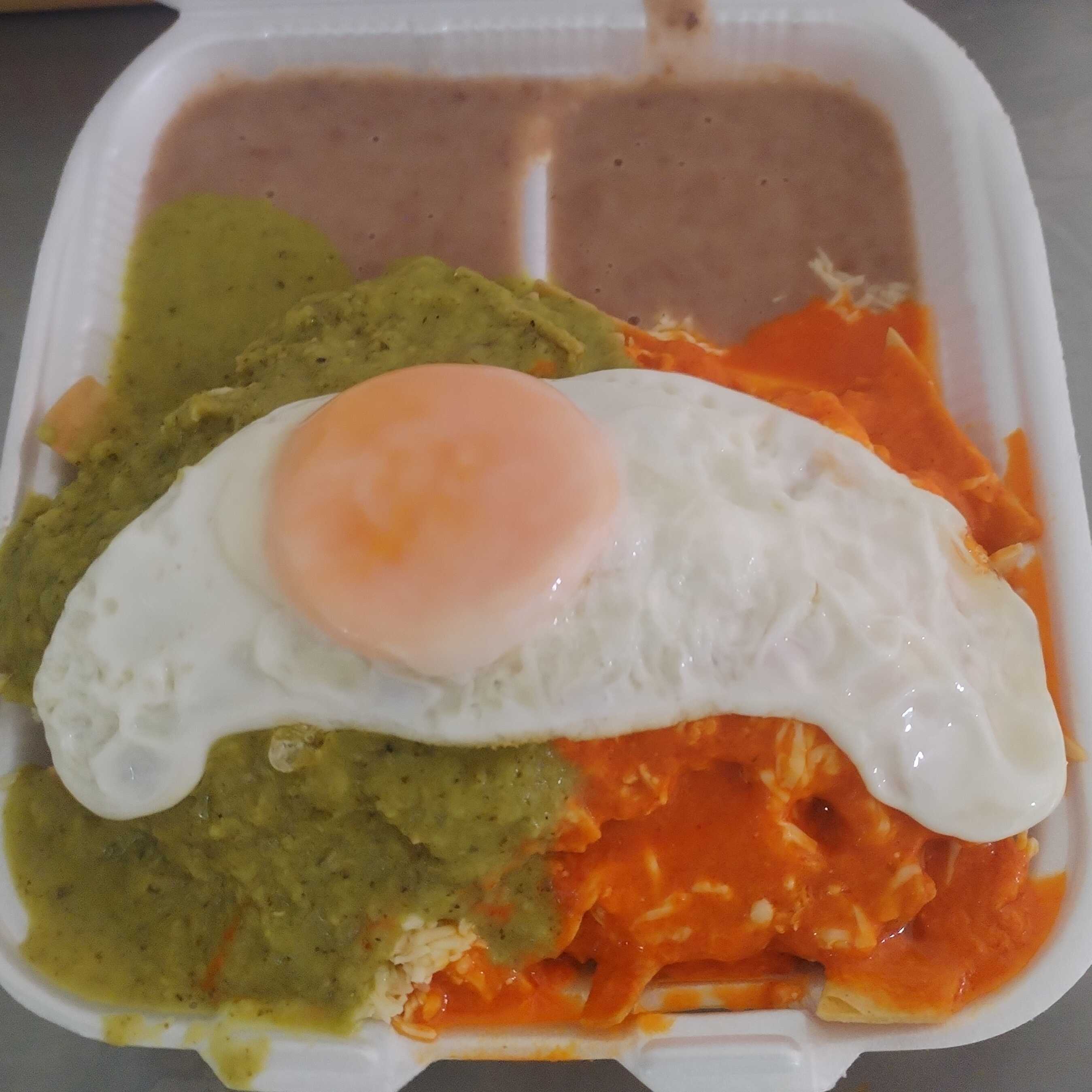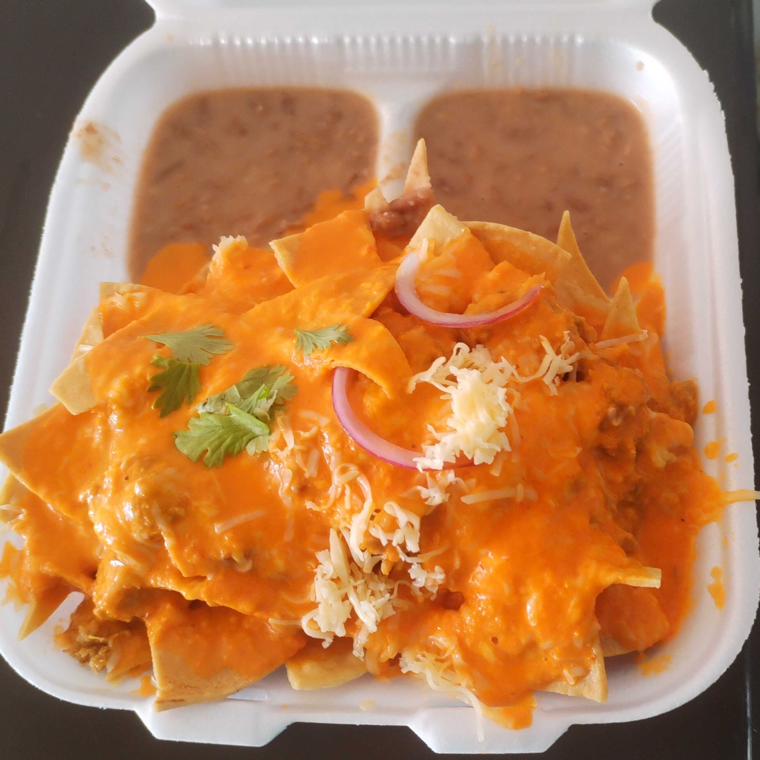 CHILAQUILES GRANDES BAÑADOS EN SALSA ROJA CON POLLO ACOMPAÑADOS DE FRIJOLES