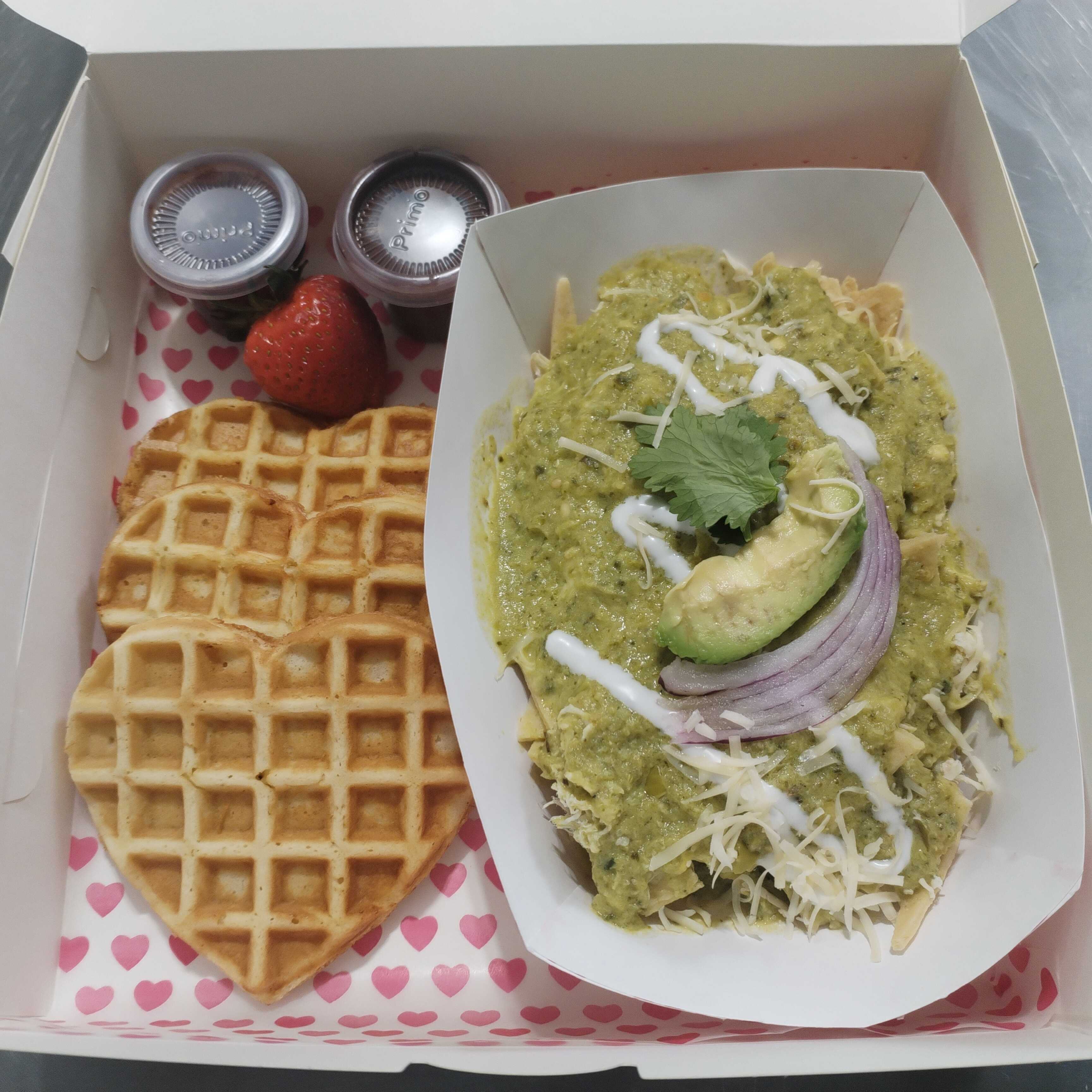 3 wafles con maple y nutella, acompañado de chilaquiles en salsa verde con pollo, queso y frijoles, se entrega en caja