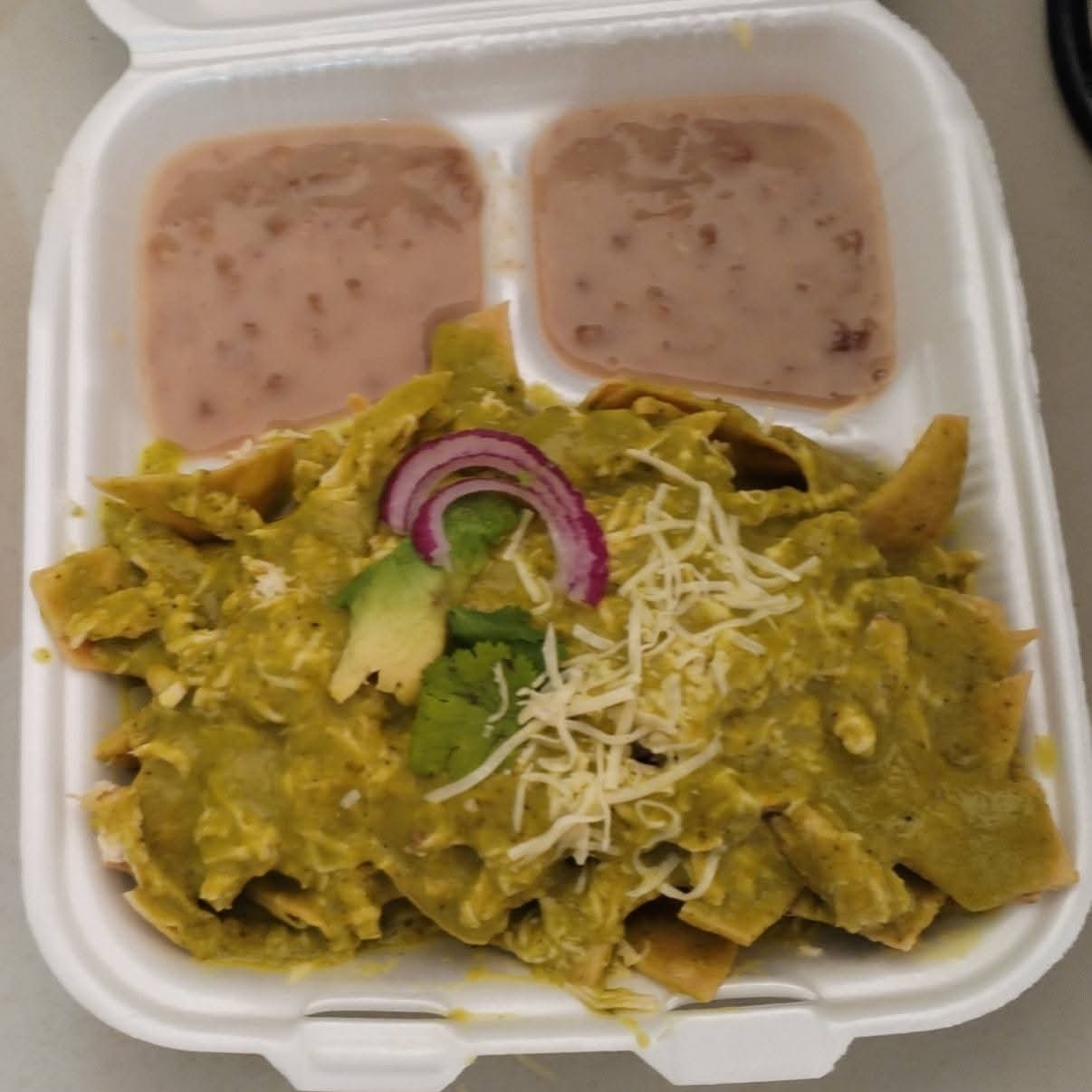 CHILAQUILES GRANDES VERDES CON POLLO ACOMPAÑADOS CON FRIJOLES