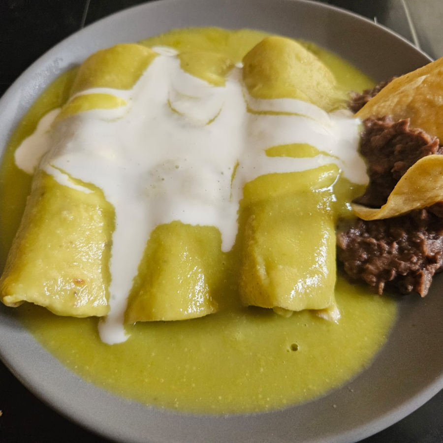 Cuatro tortillas rellenas de pollo o queso, bañadas en salsa verde con cebolla, crema y queso. Con frijoles.