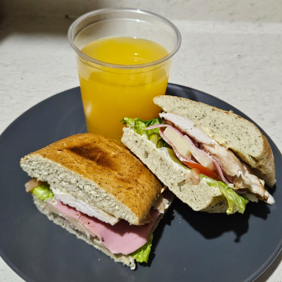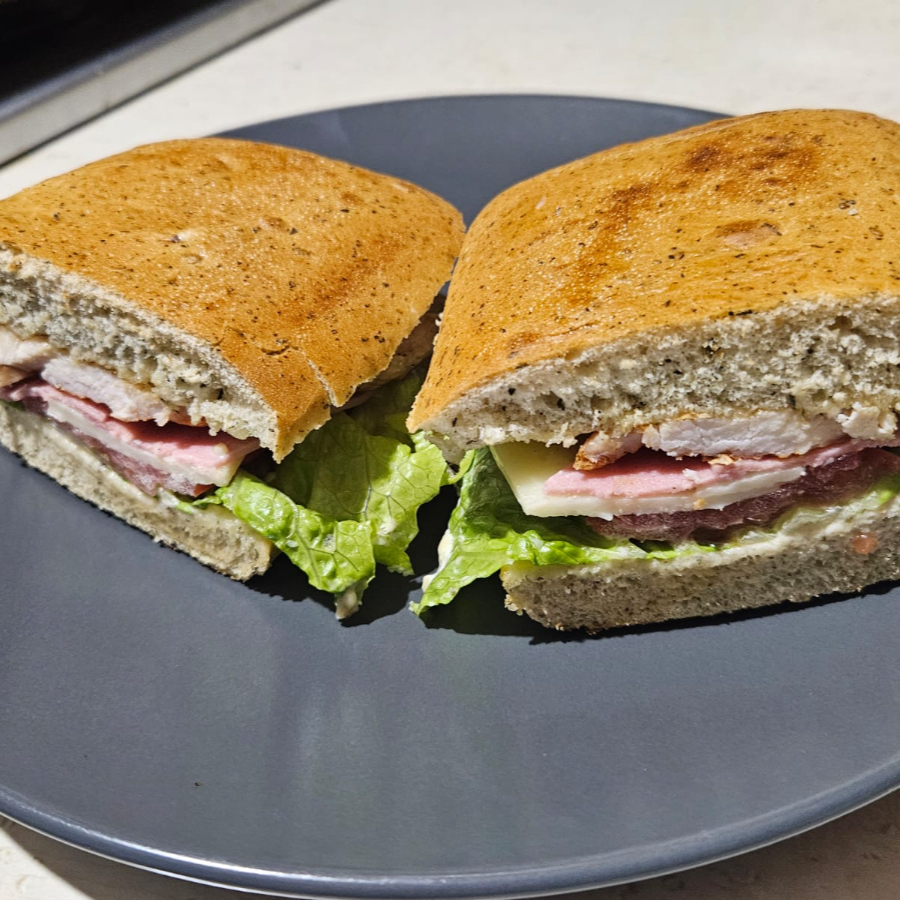 Pan chapata crujiente con jamón, queso manchego, lechuga, jitomate y aderezo de finas hierbas.