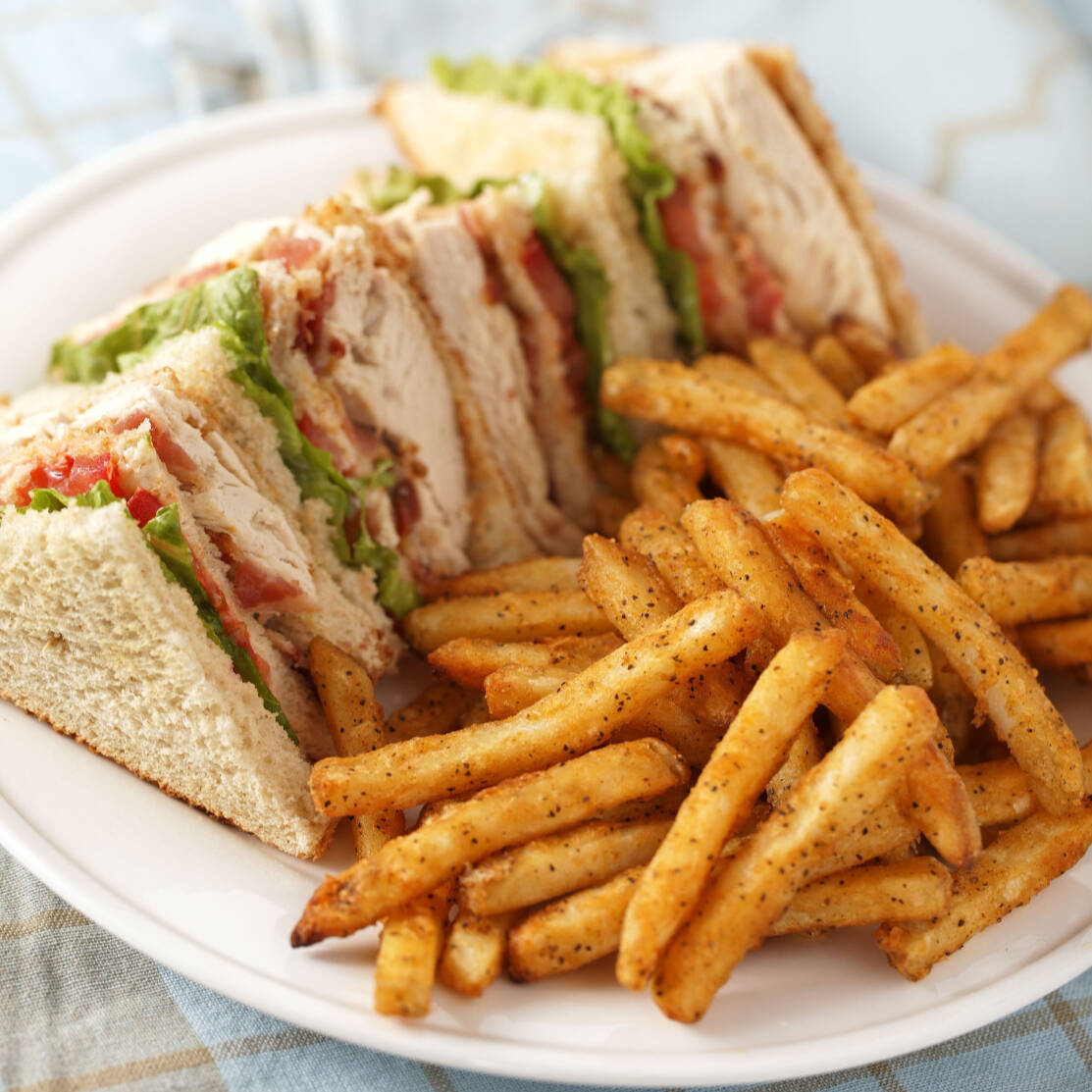 Sándwich con lechuga, tomate, queso manchego, jamón, mayonesa, pollo, tocino, acompañado de papas a la francesa.