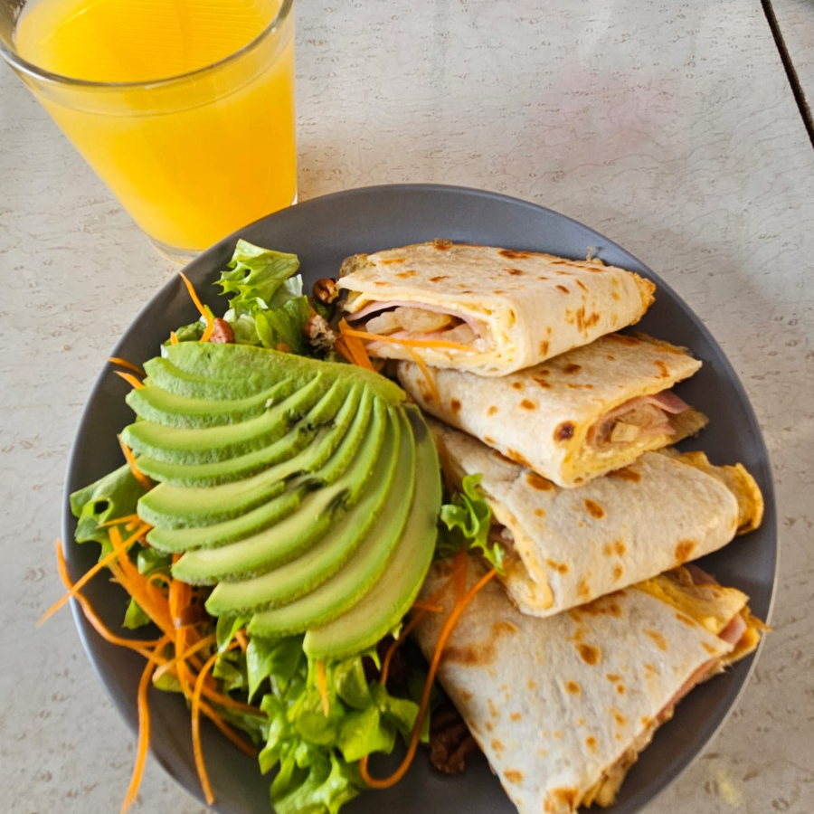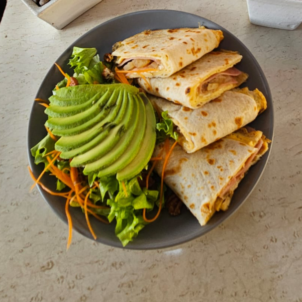 Huevo en forma de quesadilla, exterior de tortilla de harina relleno de jamón, queso y champiñones con ensalada.