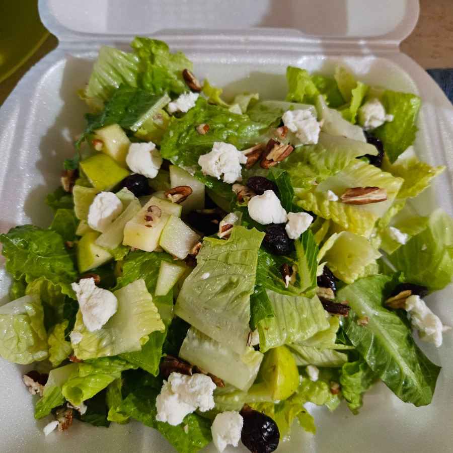 Mix de lechuga con pera, manzana, arándanos, queso de cabra y nuez con vinagreta de vino tinto.