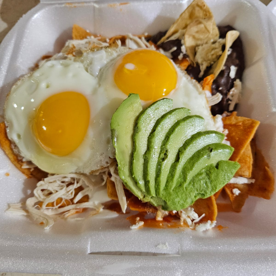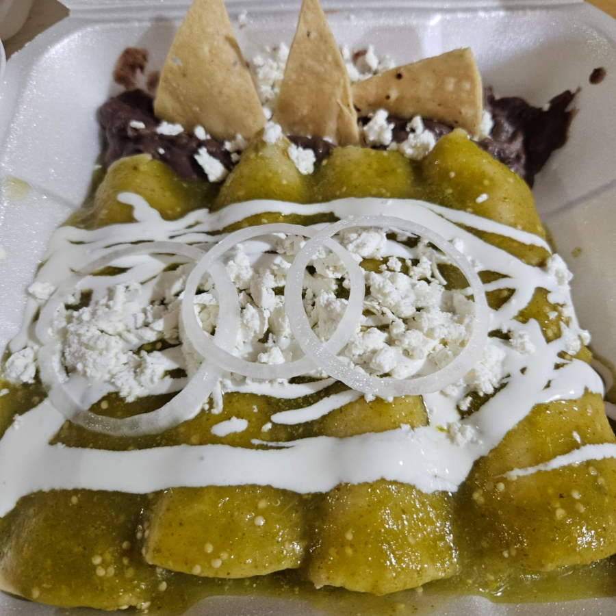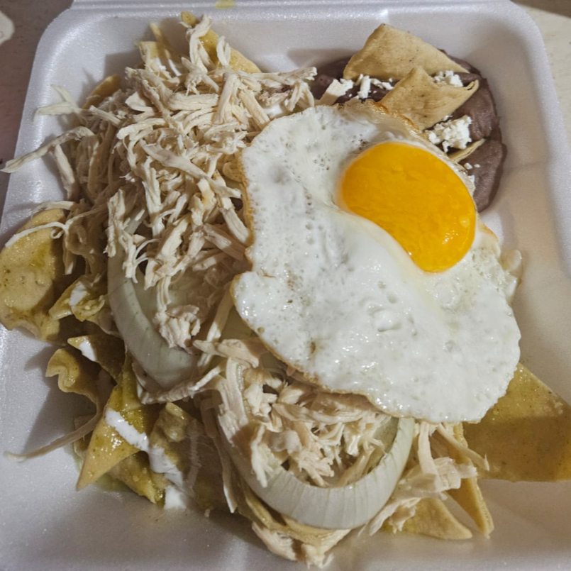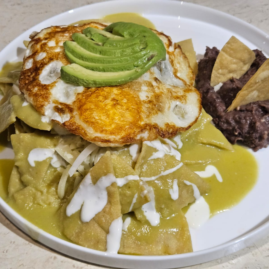 Totopos bañados en salsa verde, con cebolla, crema, aguacate y queso, acompañados de frijoles.