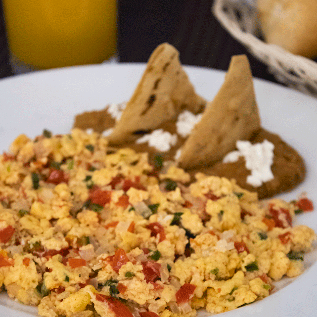 Elección de revueltos con jamón, a la mexicana, con tocino o naturales, incluye frijoles y hash brown.