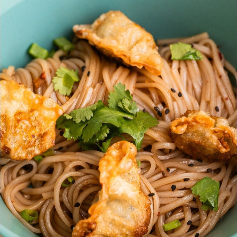 Rellenos de pollo con cilantro en base de fideos, con sopa ligera con cebollin. Foto creada con AI.