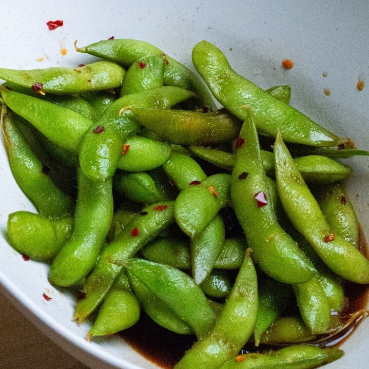 Edamames preparados con limón, soya y chilito al gusto. Tú decides si picantes o muy picantes. Foto creada con AI.