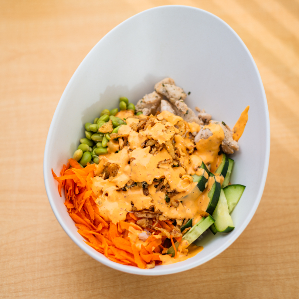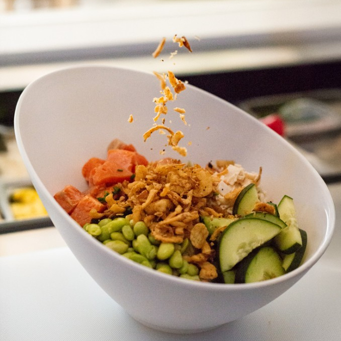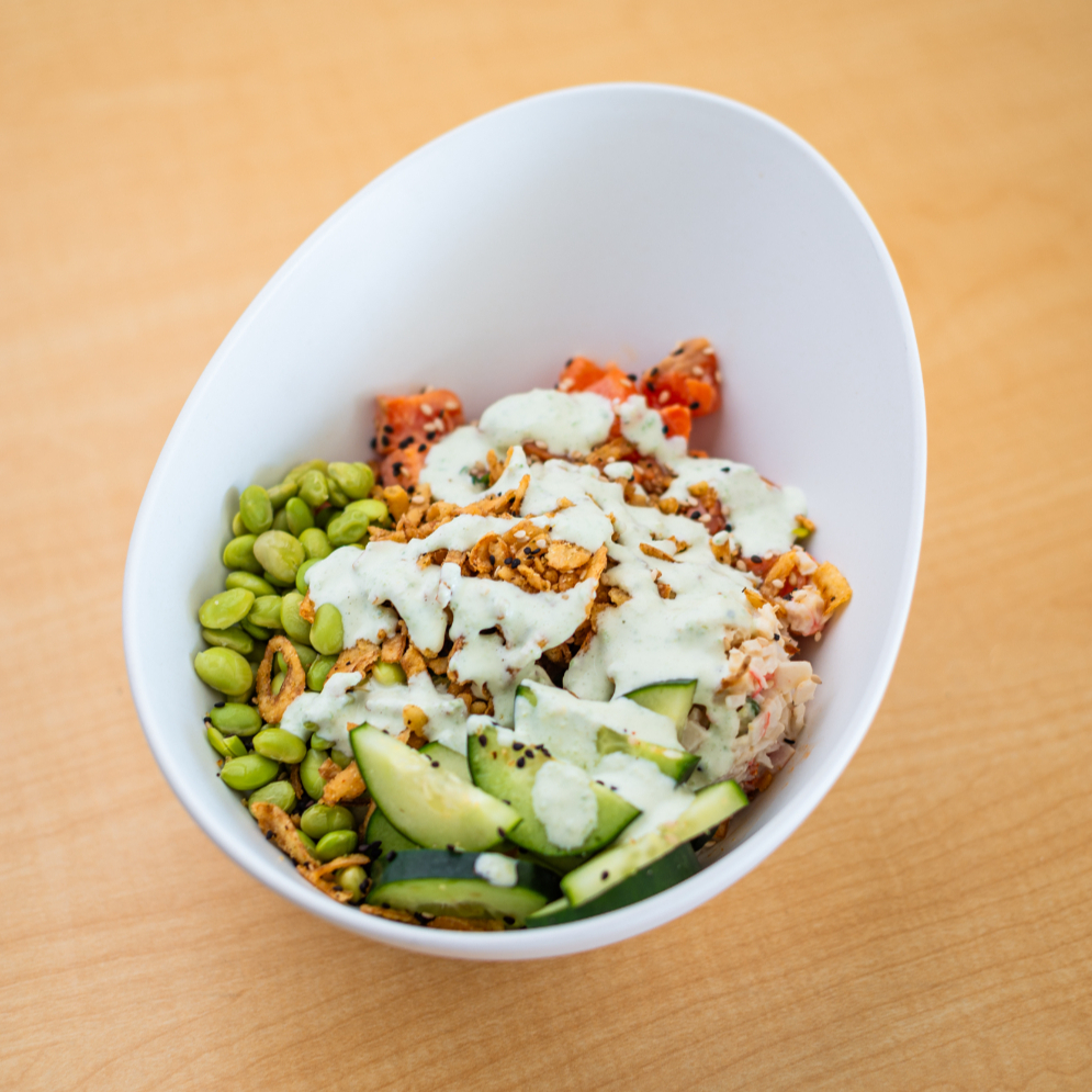 Base de arroz, salmón flameado, Tampico, edamames, pepino, jícama, cebollín, salsa soya y spicy mayo, con cebolla crunchy.
