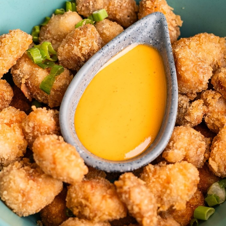 Palomitas de camarón bañadas en la salsa de tu elección. Foto creada con AI.