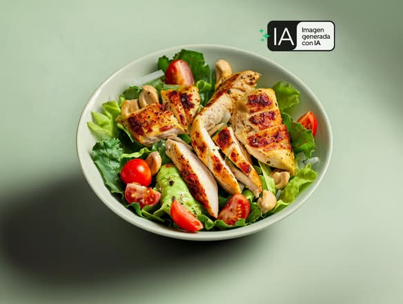 Mix de lechugas, jitomate cherry, aguacate y proteína a elección con aderezo de yogurt spicy. Foto creada con AI.