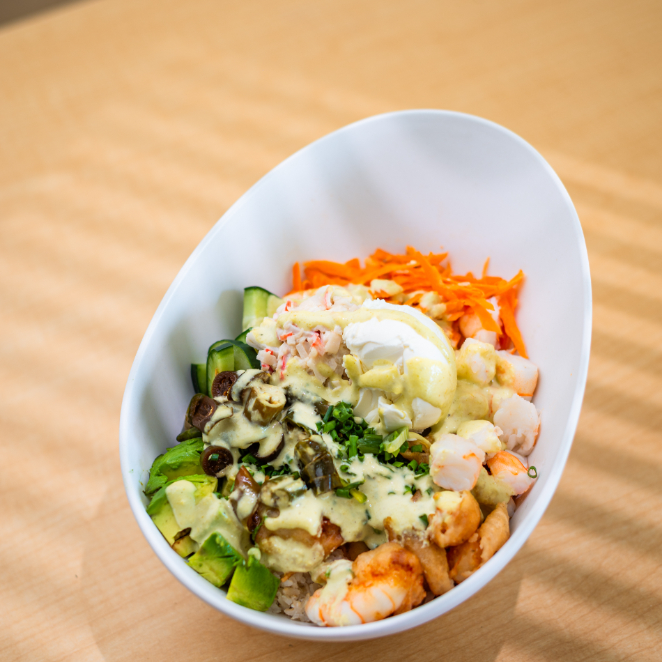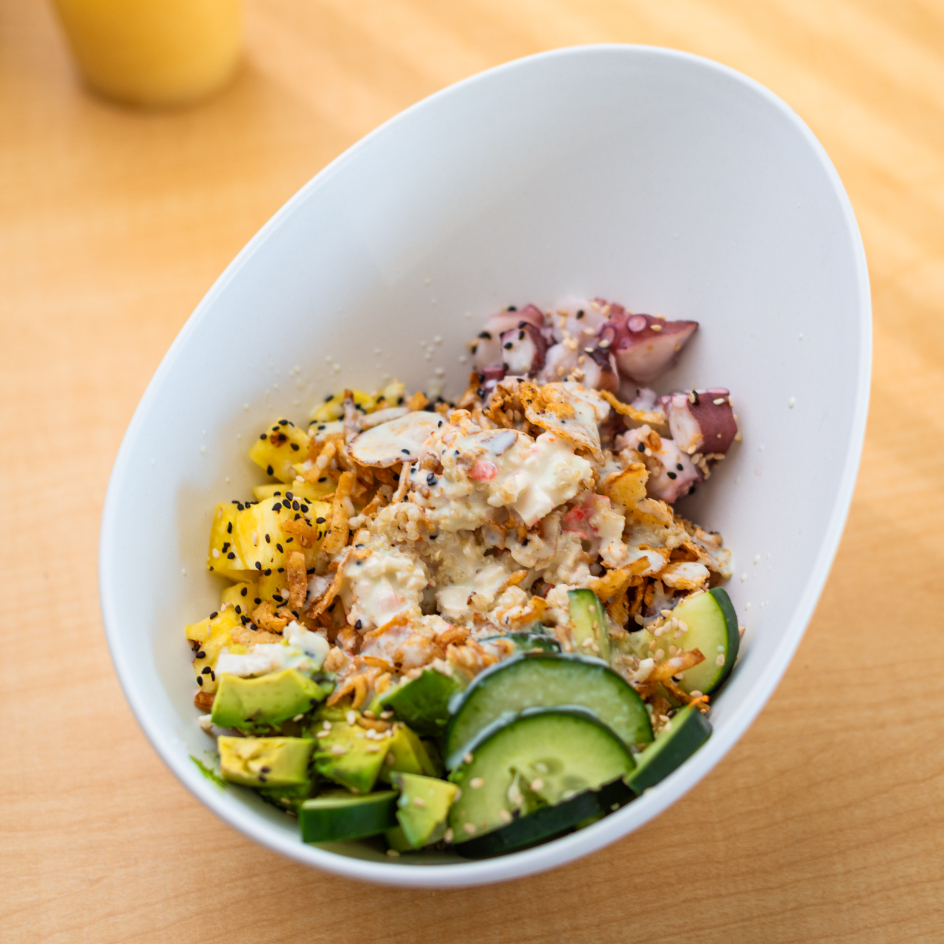 Base de quinoa, pulpo, Tampico, aguacate, piña, pepino, coco rallado, cebolla crunchy, ajonjolí, aderezo serrano.