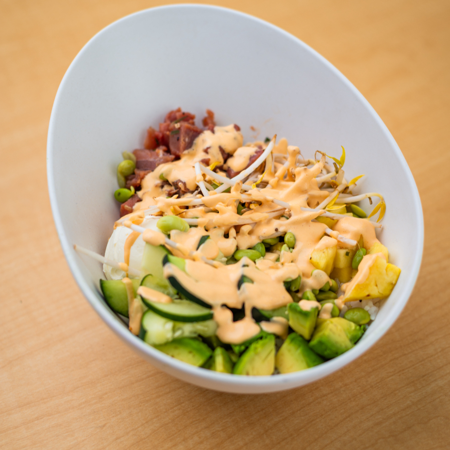 Base de arroz, atún marinado, queso crema, aguacate, edamames, pepino, piña, jícama, germen de soya, aderezo cremoso de jalapeño.