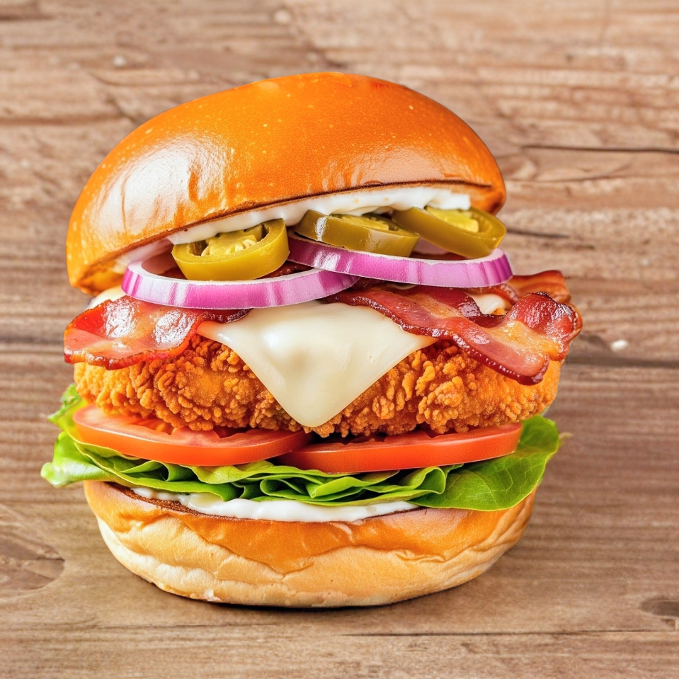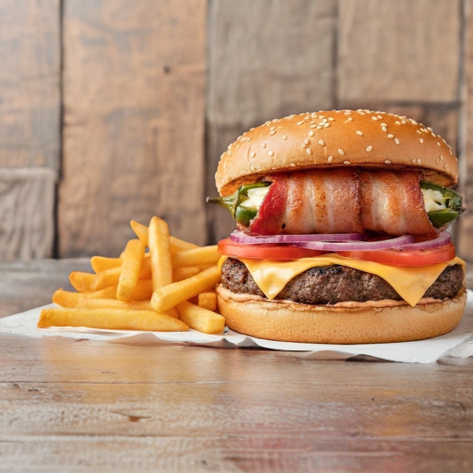 Pollo , tocino , queso americano, queso asadero, tomate , cebolla, lechuga, jalapeños,+ papas a la francesa