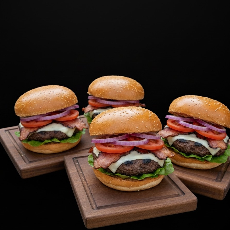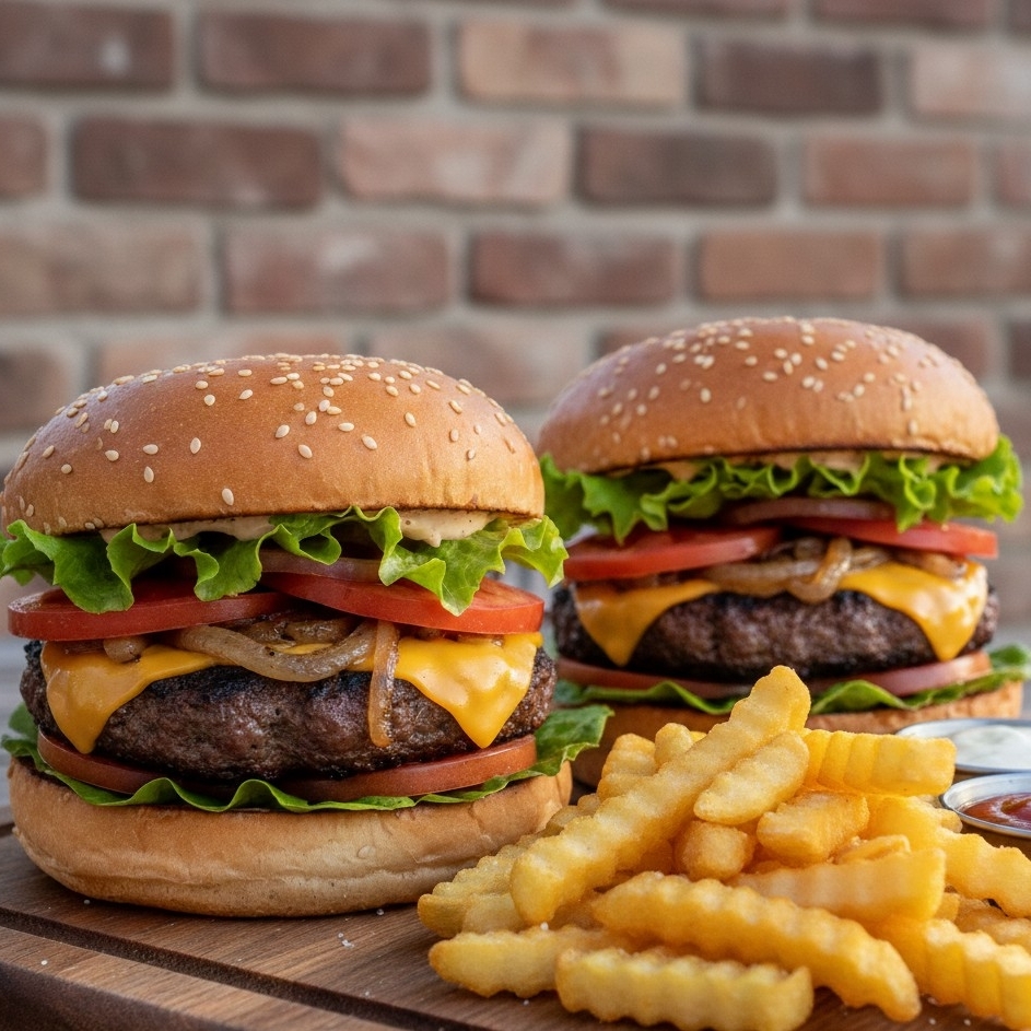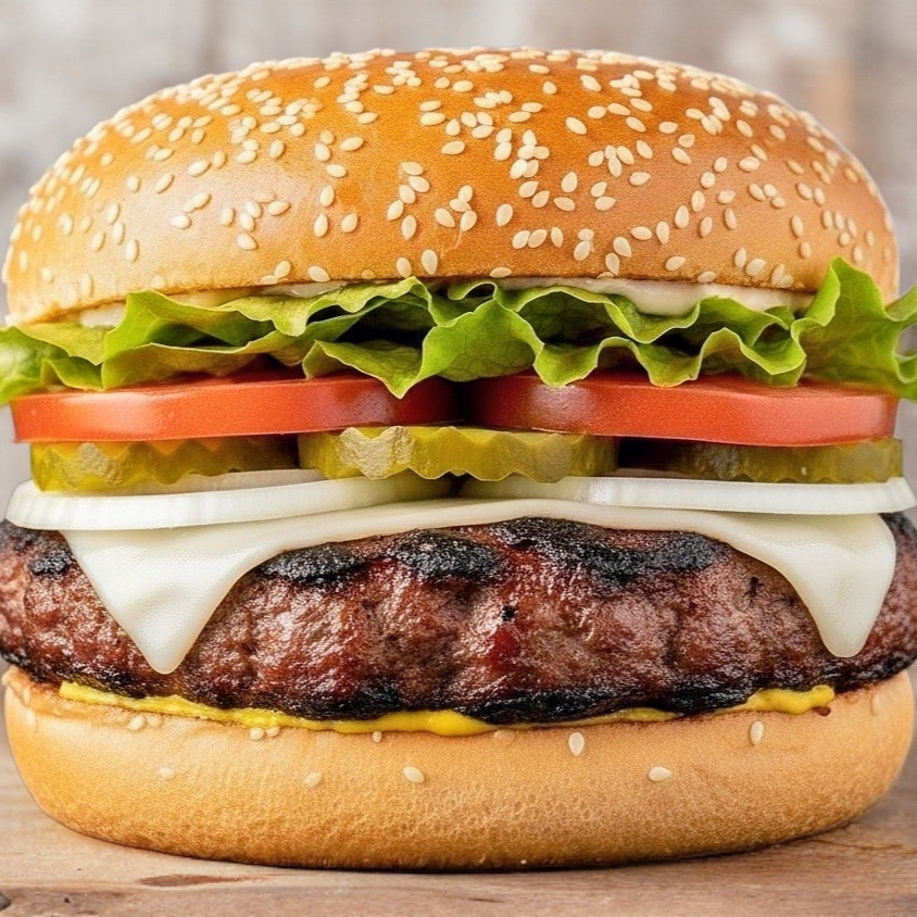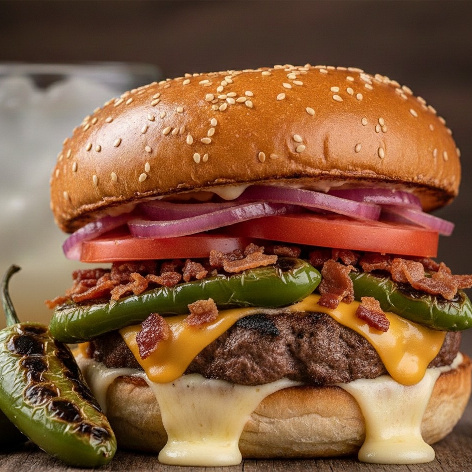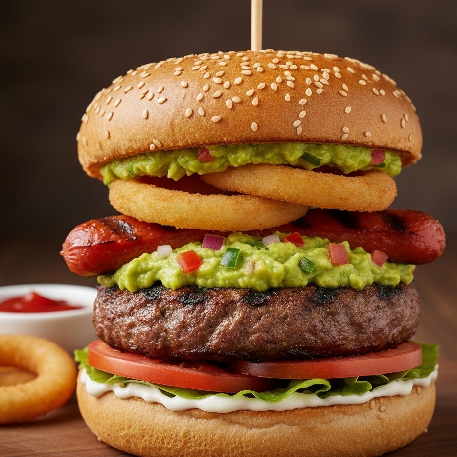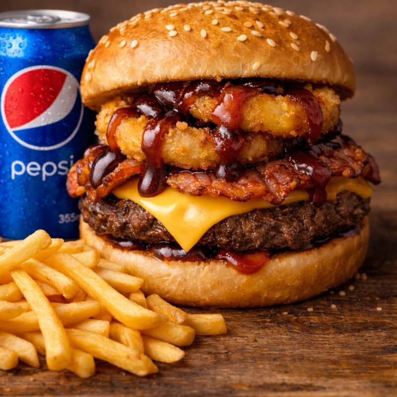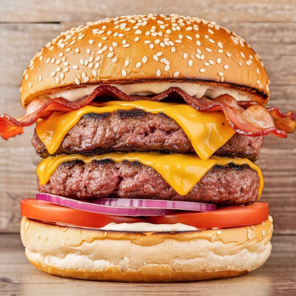 Doble carne , tocino pepinillos , queso americano , cebolla tomate mostaza mayonesa