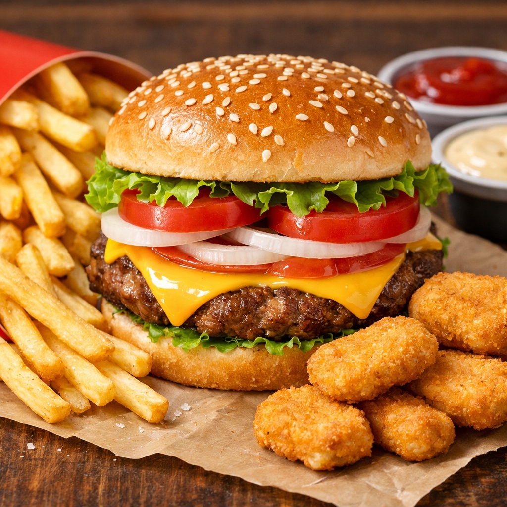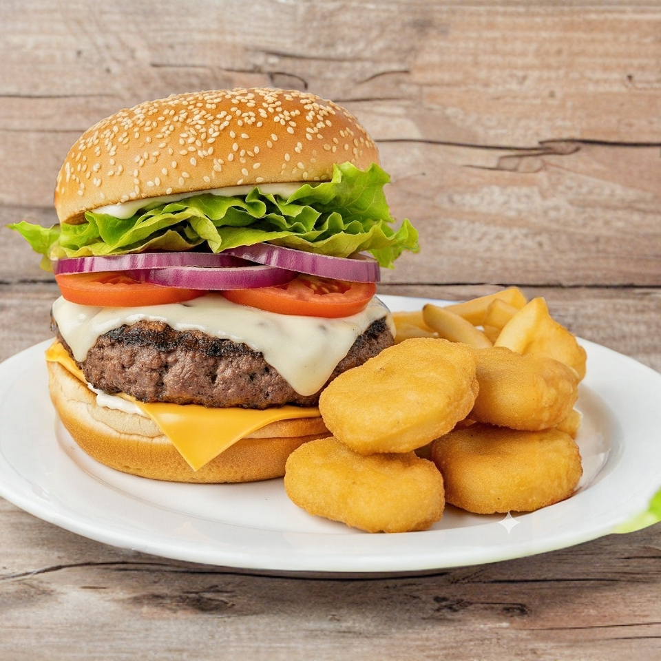 Carne, queso manchego, queso americano, cebolla, tomate lechuga+ papas,nuggets y refresco