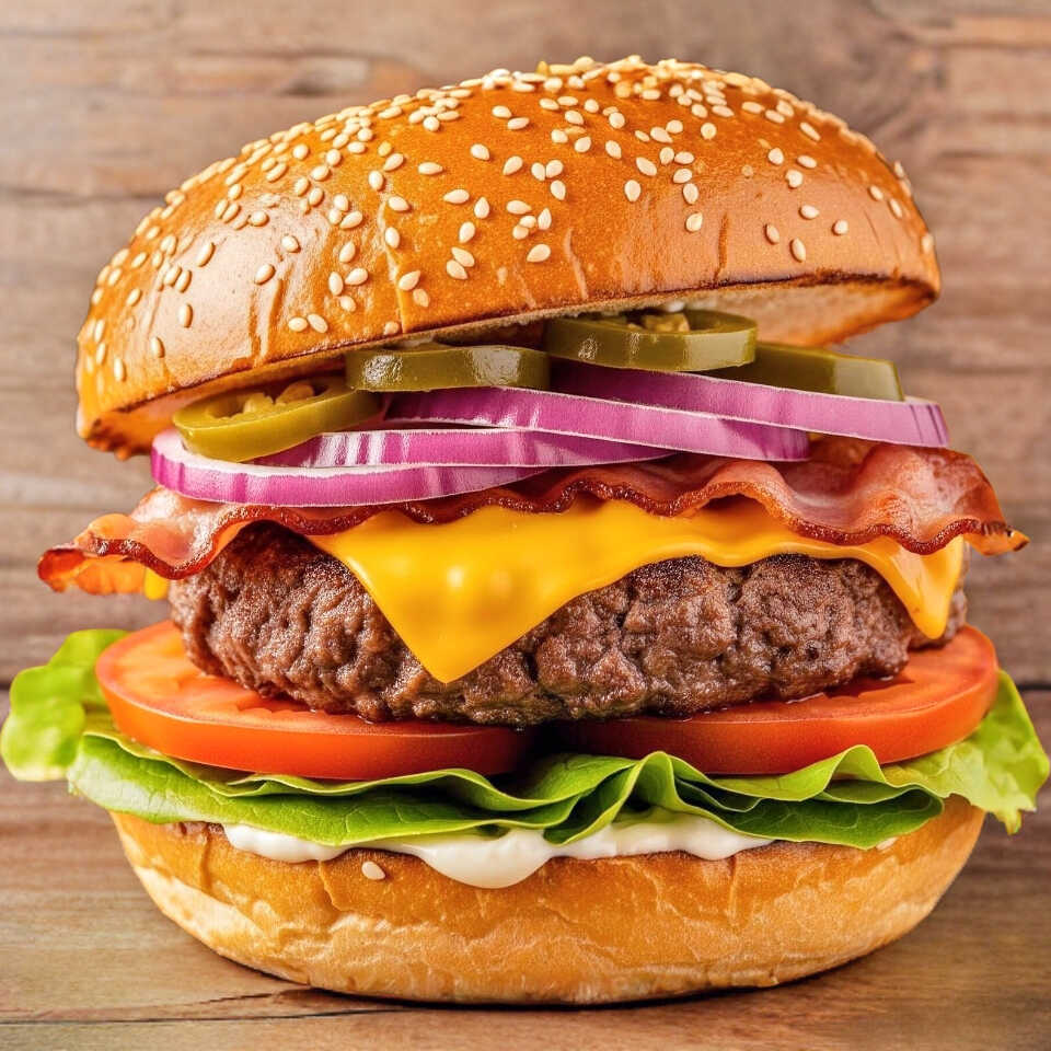 Carne tocino , jalapeño, queso , cebolla , tomate, lechuga