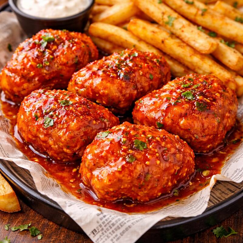 4 pz De Boneles bañados en salsa mango habanero incluye papas ala francesa