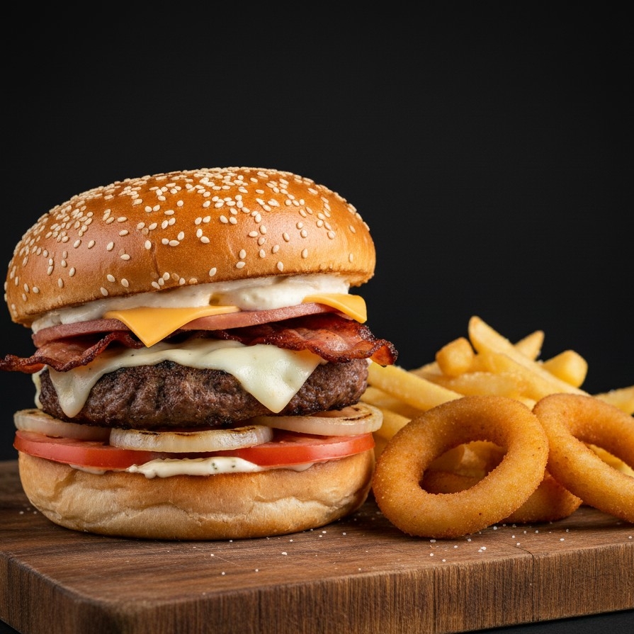 Carne tocino queso americano queso asadero cebolla tomate pepinillos jamon +papas 4 aros de cebolla