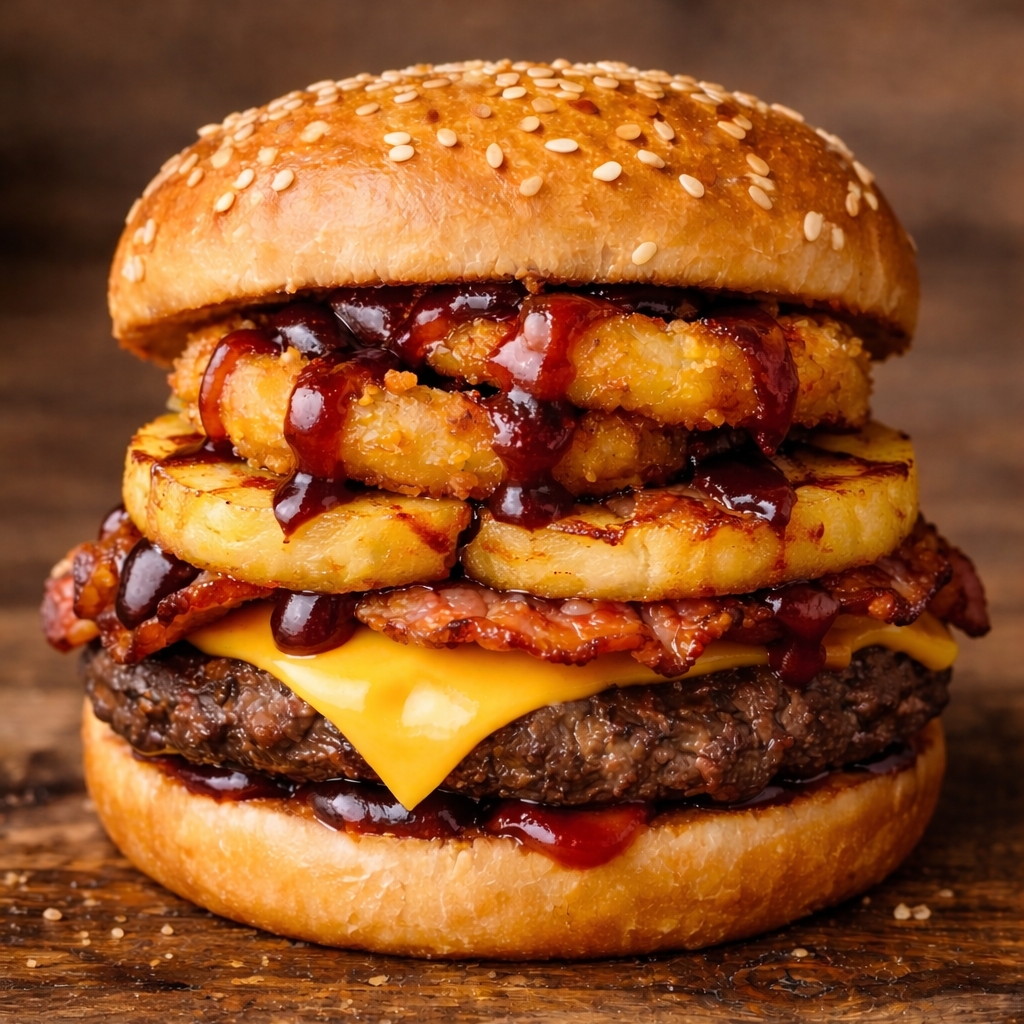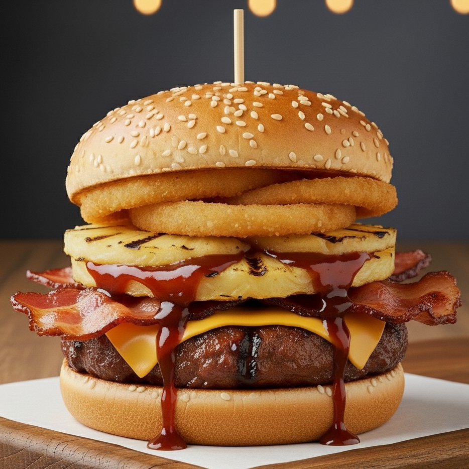 Arrachera ,aros de cebolla piña ,queso , BBQ , tocino