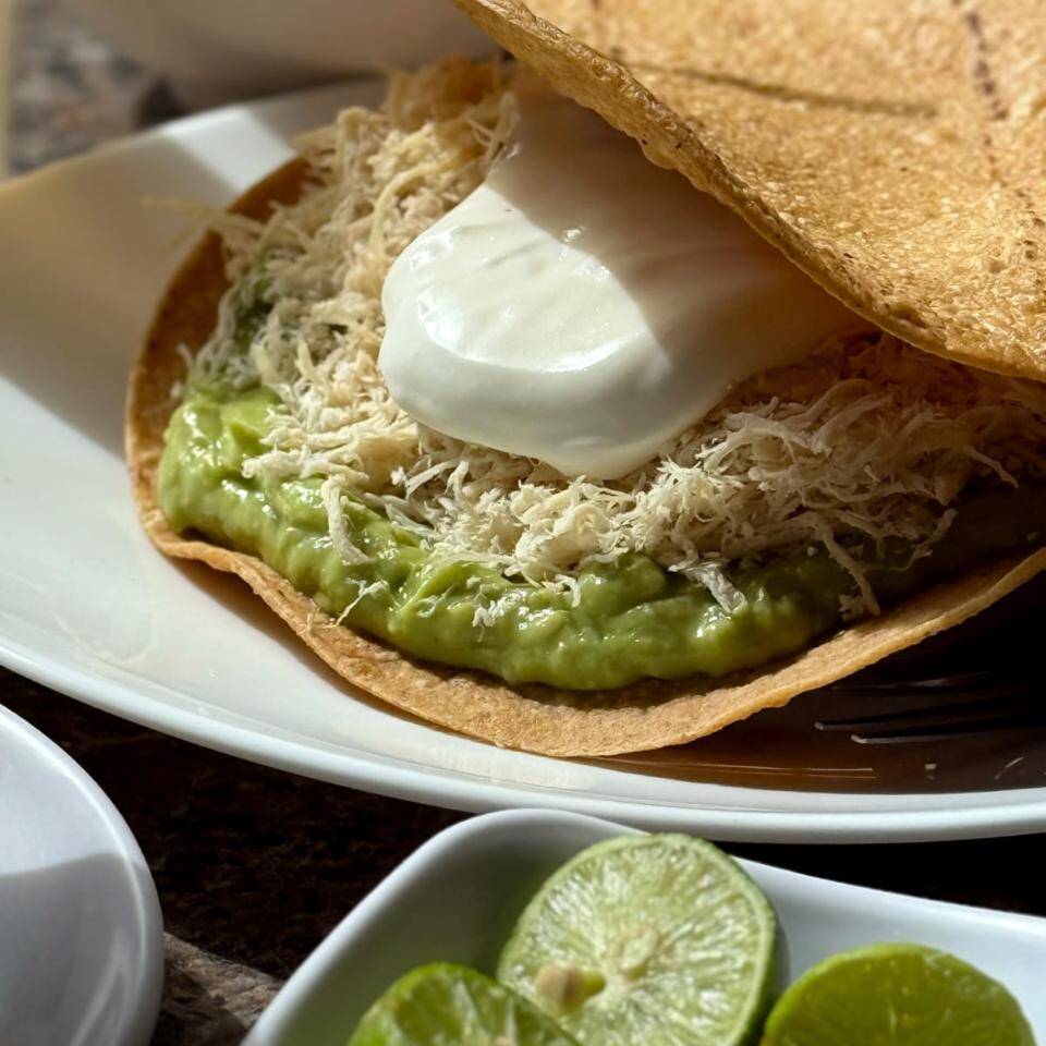 Tostada especial con 1/4 de pechuga de pollo (95 g), guacamole y crema acidificada.
