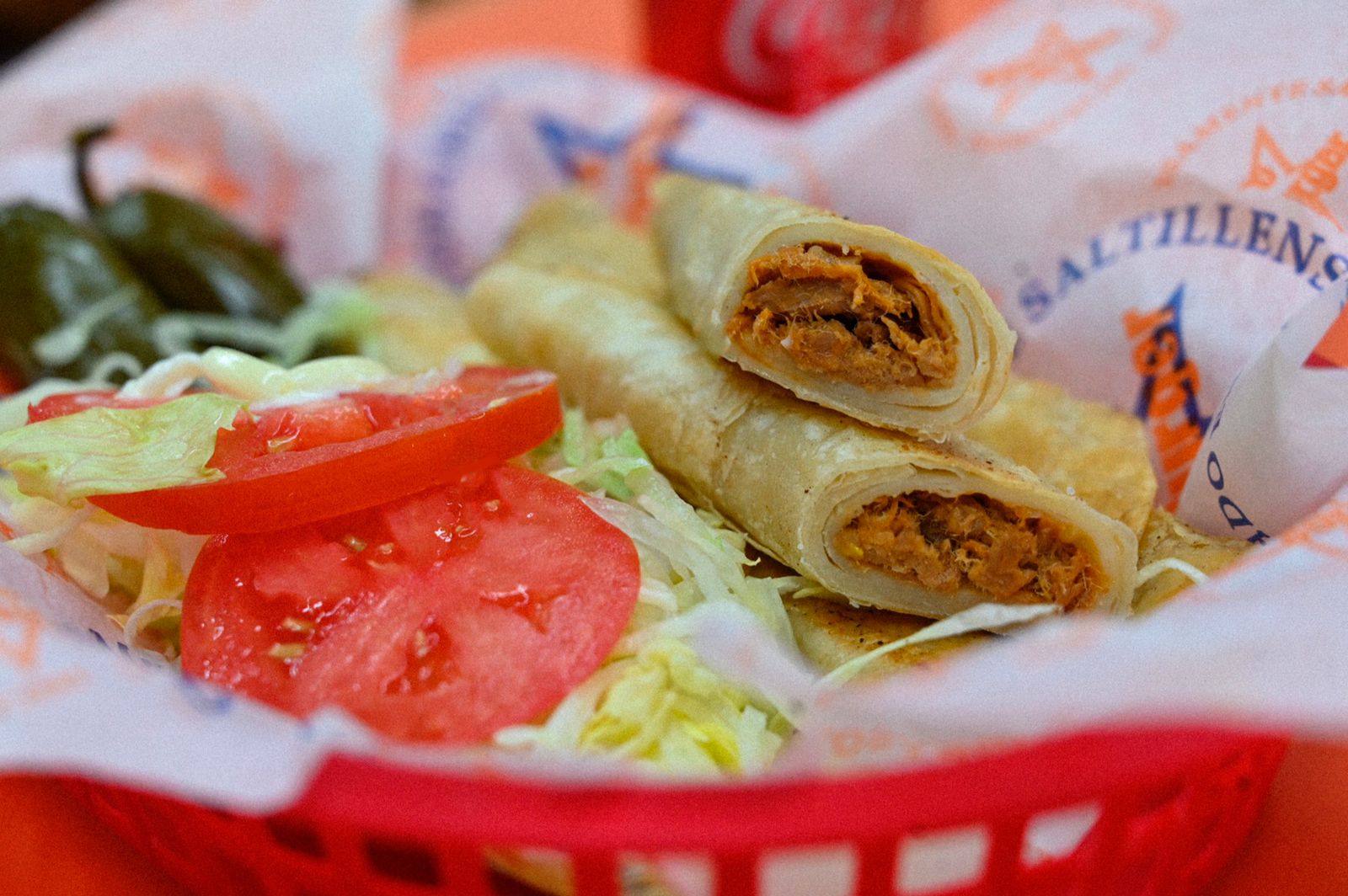 Burritos de deshebrada guisada en salsa de tomate acompañados de ensalada de lechuga y tomate