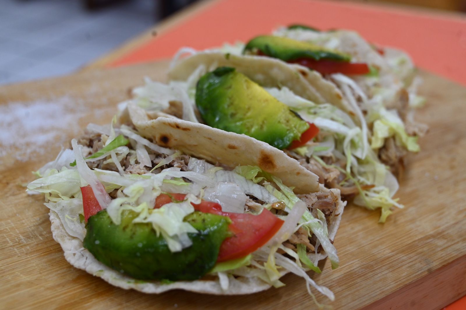 Tacos de pierna en tortilla de harina con lechuga, tomate, y aguacate