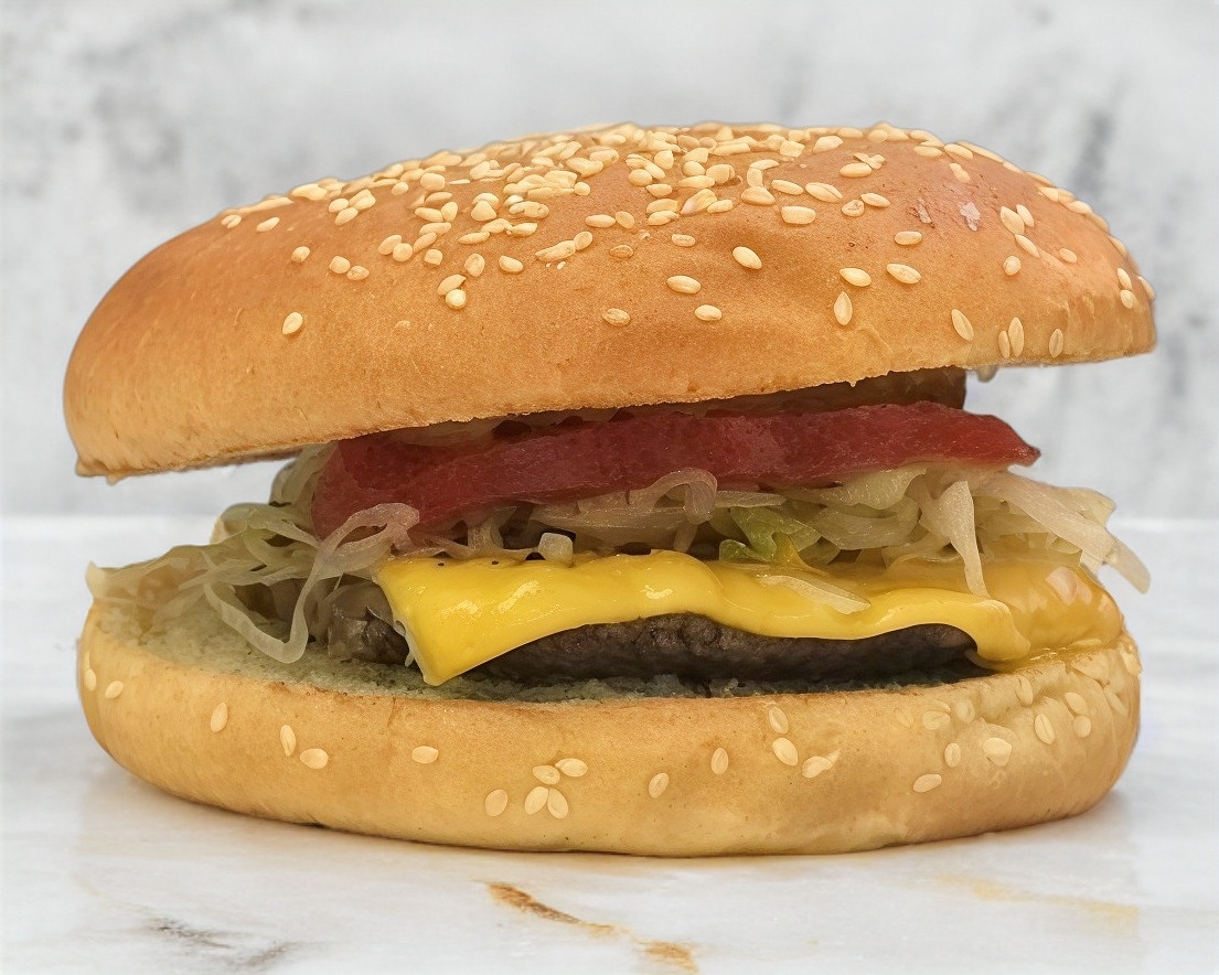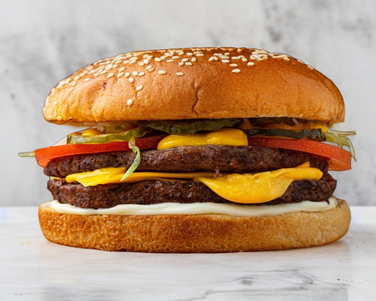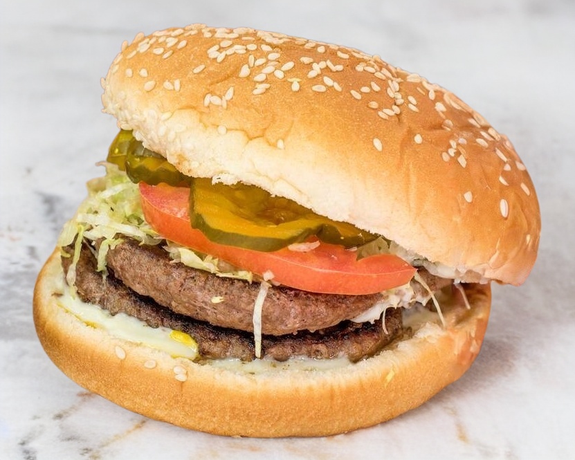 Hamburguesa con doble carne y doble queso amarillo con lechuga, tomate, pepinillos, mayonesa y mostaza