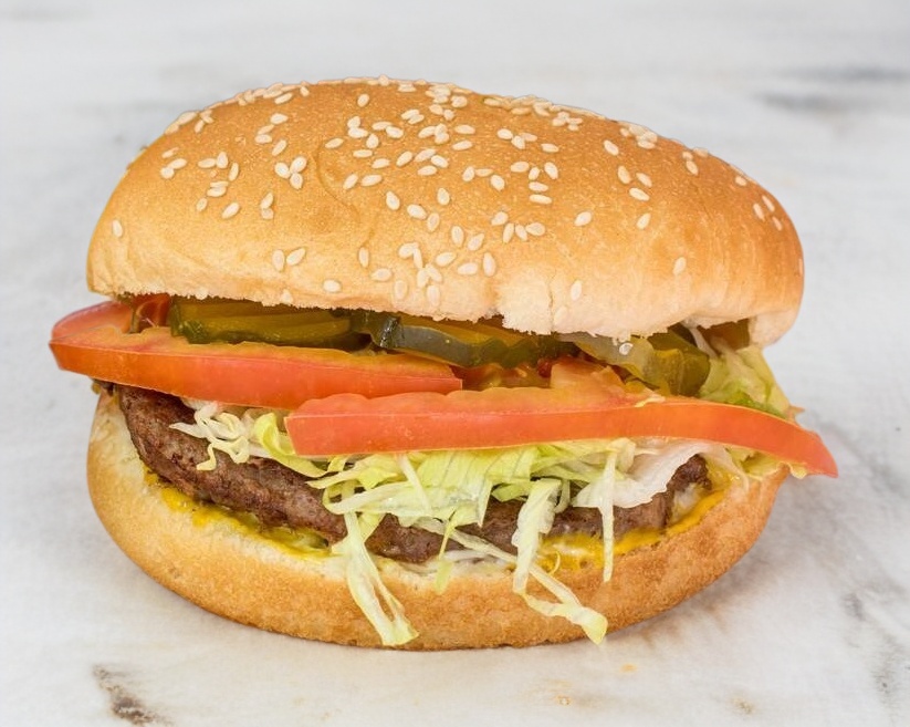 Hamburguesa con 1 carne, queso amarillo, lechuga, tomate, pepinillos, mayonesa y mostaza