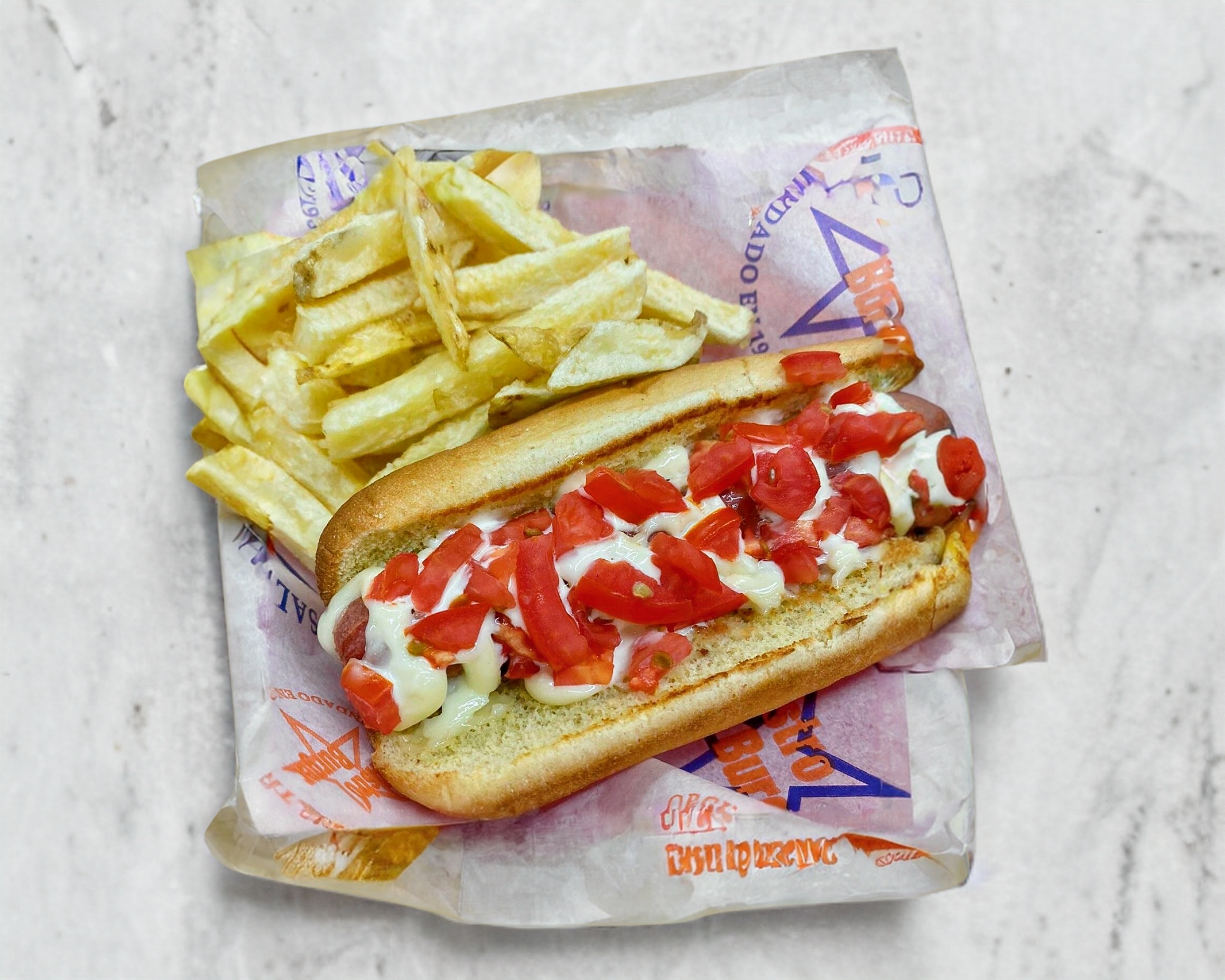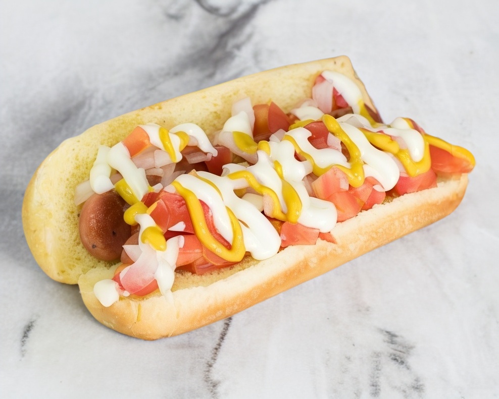Hot dog con salchicha de 15cms, mayonesa y tomate. Los complementos se envían por separado