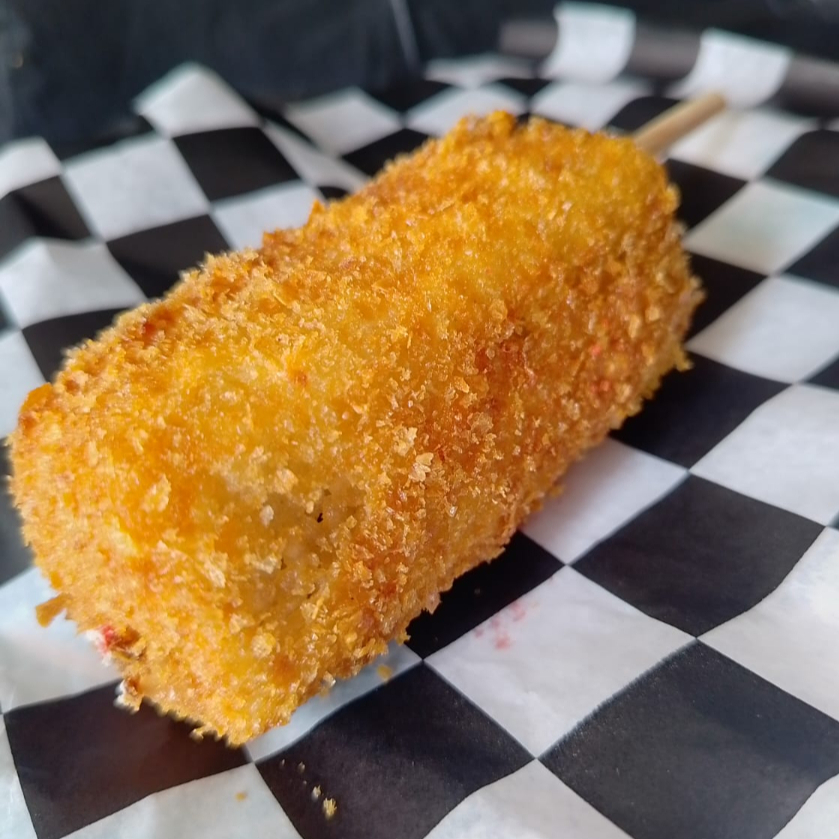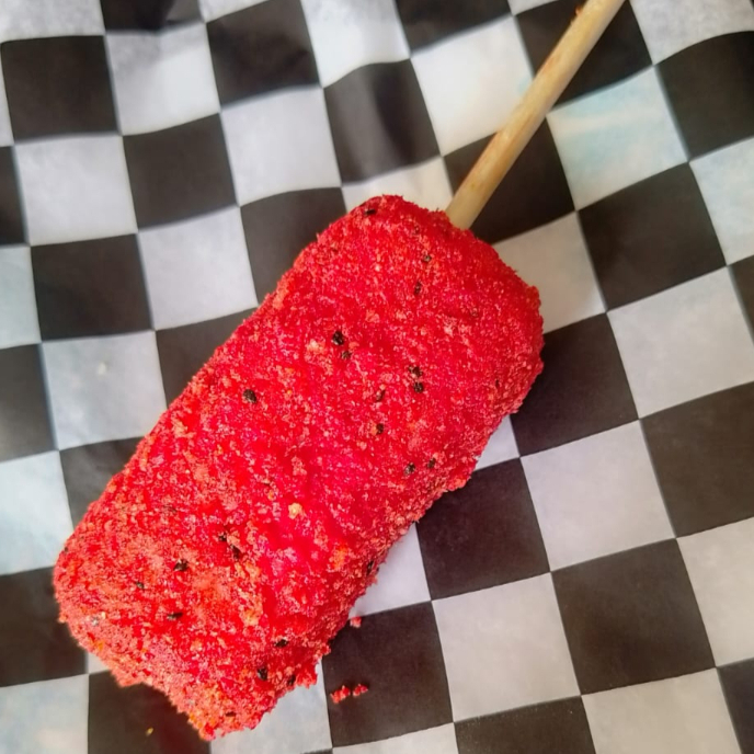 Banderilla de sushi rellena de camaron, pepino, philadelphia y aguacate empanizada con polvo de chetos flamin hot..