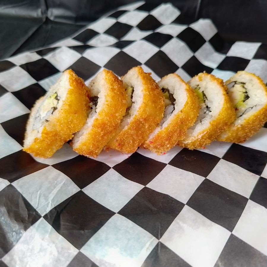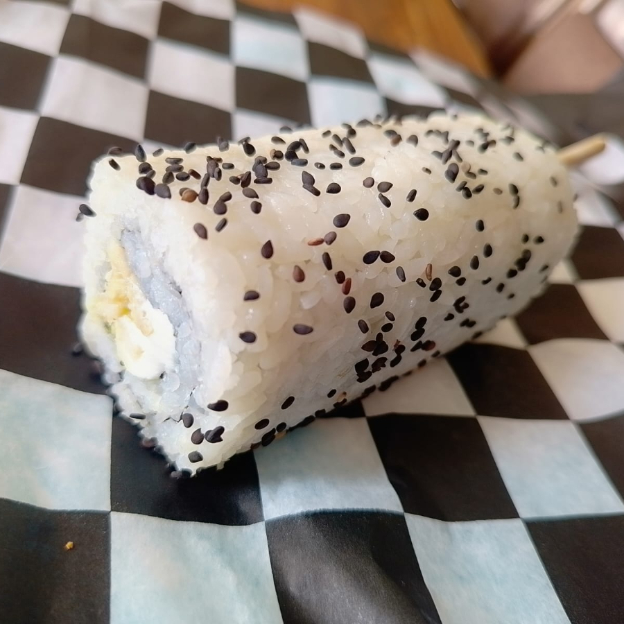 Banderilla de sushi rellena de camaron, pepino, philadelphia y aguacate empanizada.