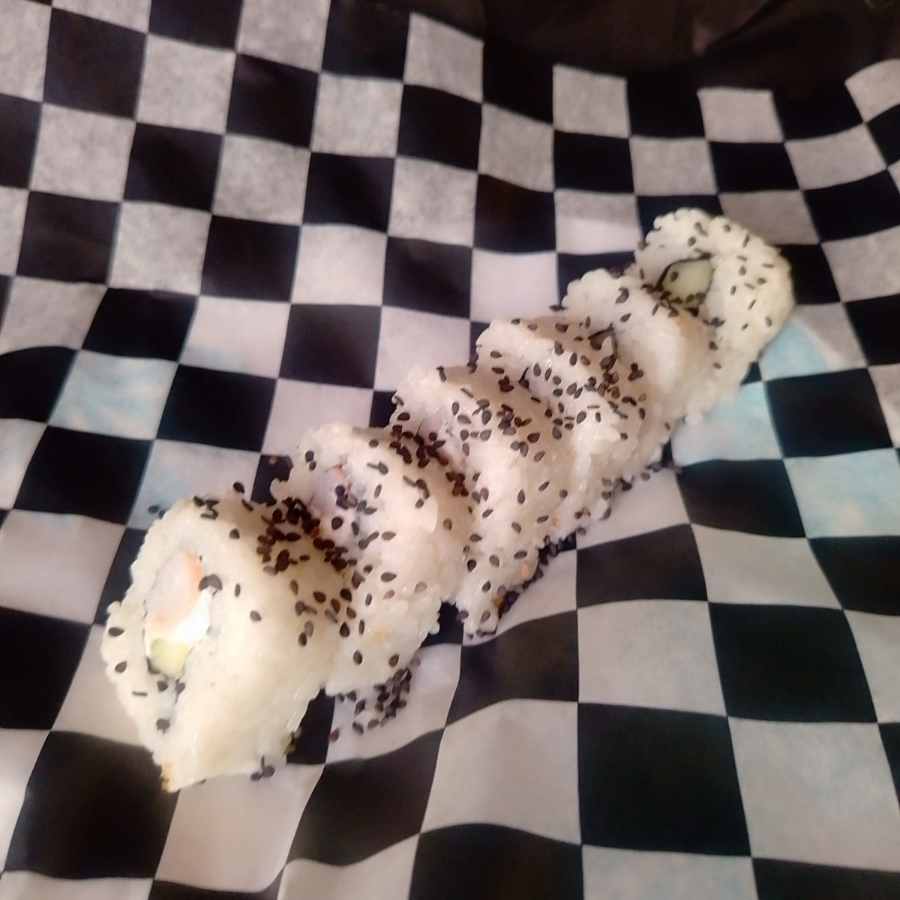 Por dentro: camaron, pepino, philadelphia y aguacate Por fuera: ajonjoli negro