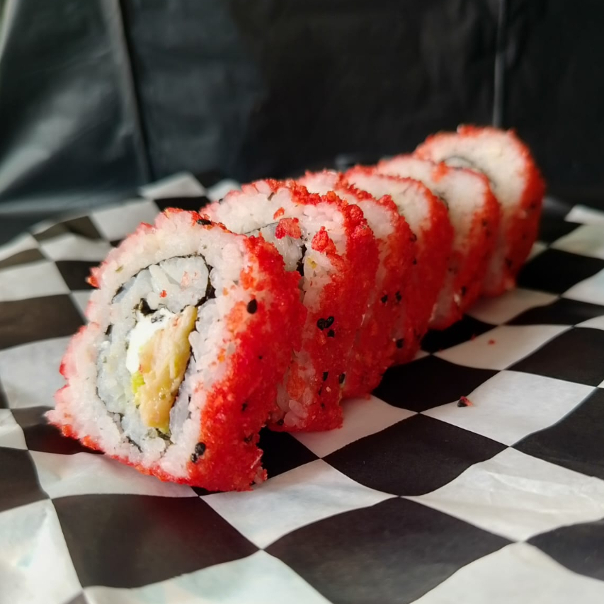 Por dentro: Camaron, pepino, philadelphia y aguacate Por fuera: Chetos flaming hot