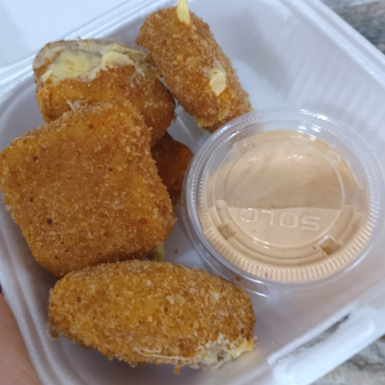 5 cuadritos de queso manchego de 20grC/U empanizados y acompañados de BBQ.