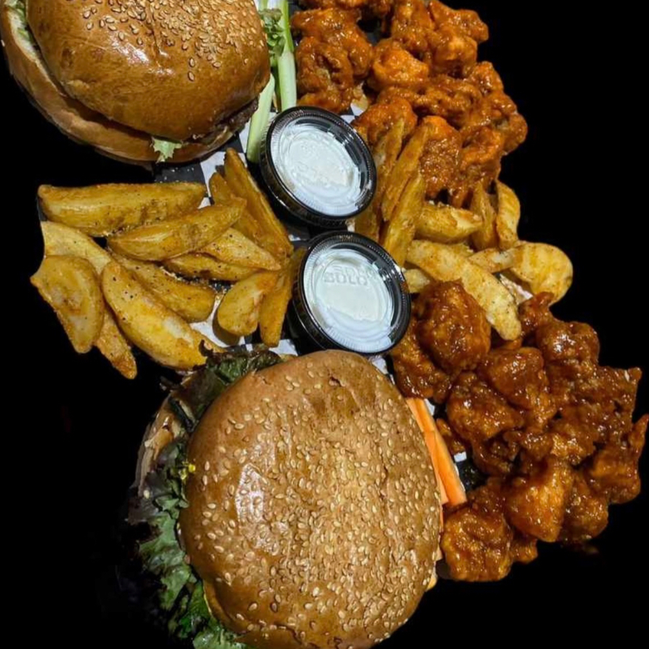 INCLUYE. 2 Hamburguesas Clásicas, 1/2 Kilo de Alitas, 1/2 Kilo de Bonelees, Orden de Papas Gajo, Aderezos, Zanahoria y Apio