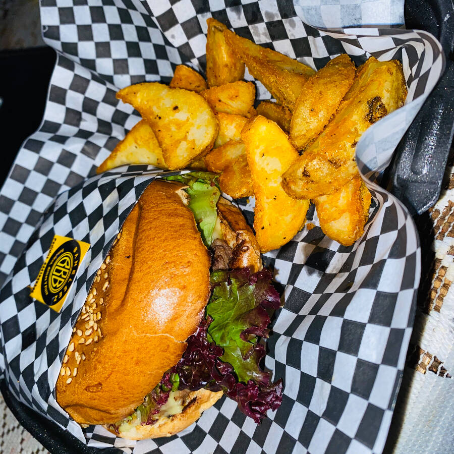 Hamburguesa de pollo. Incluye papas gajo, queso manchego, tocino, y aderezo bbq. Acompañado de papas gajo y aderezos