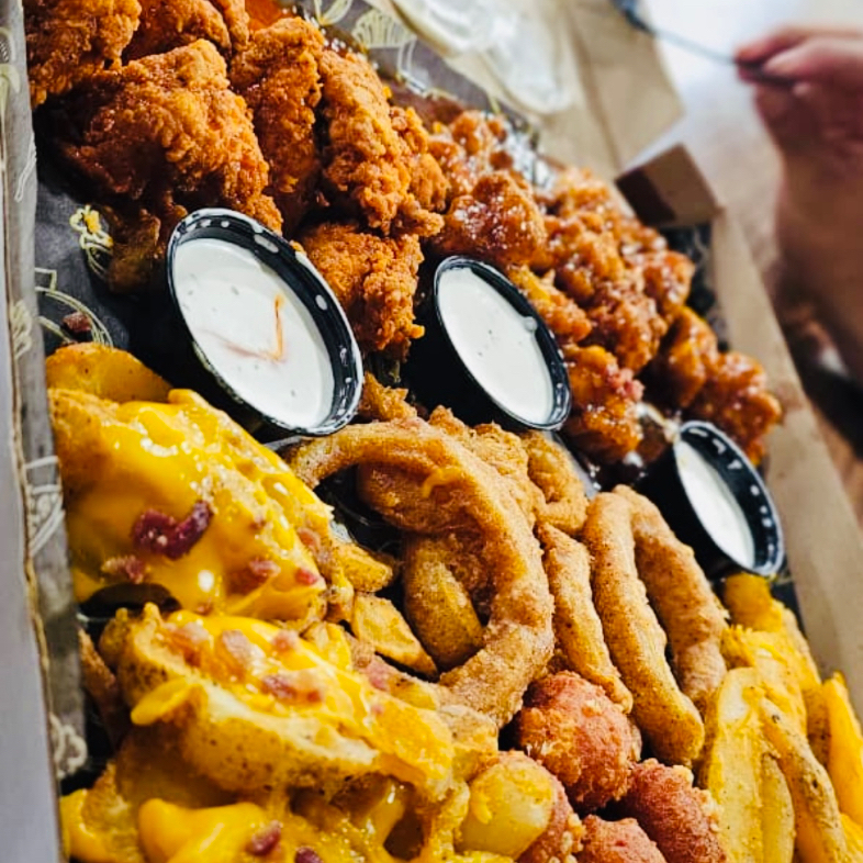 INCLUYE. 1KG de boneless, 1 Orden de Pizza Dip, 1 Orden de Papas Cheddar, 1 Orden de Aros de Cebolla, 1 Orden de Papas Naturales, Aderezos Zanahoria y Apio